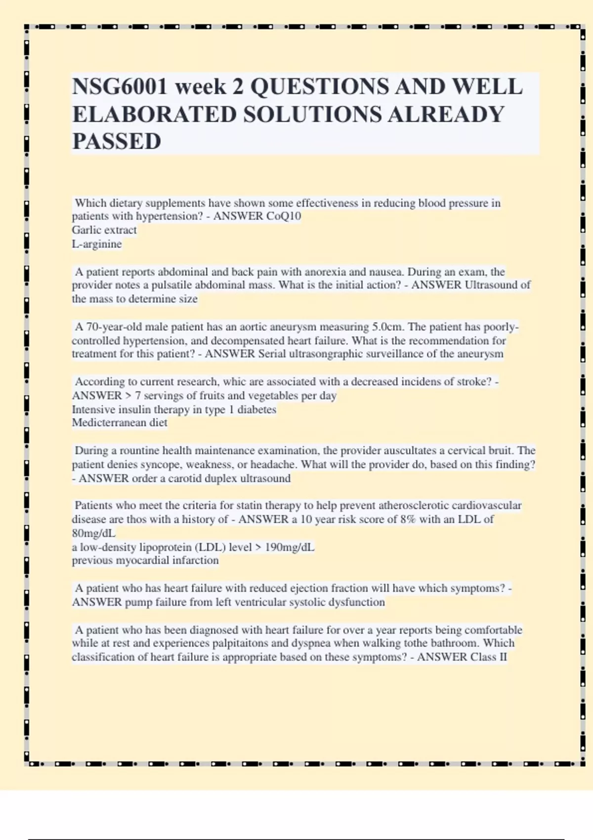 NSG6001 week 2 QUESTIONS AND WELL ELABORATED SOLUTIONS ALREADY PASSED Which dietary supplements have shown some effectiveness in reducing blood pressure in patients with hypertension? - ANSWER CoQ10 Garlic extract L-arginine A patient reports abdominal and back pain with anorexia and nausea. During an exam, the provider notes a pulsatile abdominal mass. What is the initial action? - ANSWER Ultrasound of the mass to determine size A 70-year-old male patient has an aortic aneurysm measuring 5.0cm. The patient has poorly controlled hypertension, and decompensated heart failure. What is the recommendation for treatment for this patient? - ANSWER Serial ultrasongraphic surveillance of the aneurysm According to current research, whic are associated with a decreased incidens of stroke? - ANSWER > 7 servings of fruits and vegetables per day Intensive insulin therapy in type 1 diabetes Medicterranean diet During a rountine health maintenance examination, the provider auscultates a cervical bruit. The patient denies syncope, weakness, or headache. What will the provider do, based on this finding? - ANSWER order a carotid duplex ultrasound Patients who meet the criteria for statin therapy to help prevent atherosclerotic cardiovascular disease are thos with a history of - ANSWER a 10 year risk score of 8% with an LDL of 80mg/dL a low-density lipoprotein (LDL) level > 190mg/dL previous myocardial infarction A patient who has heart failure with reduced ejection fraction will have which symptoms? - ANSWER pump failure from left ventricular systolic dysfunction A patient who has been diagnosed with heart failure for over a year reports being comfortable while at rest and experiences palpitaitons and dyspnea when walking tothe bathroom. Which classification of heart failure is appropriate based on these symptoms? - ANSWER Class II A patient who has class II heart failure is taking an ACE inhibitor and reports a recurrent cough that does not interfere with sleep or activity. What will the provider do intitaly to manage this patient? - ANSWER Provide reassurance that this is a benign side effect A patient reports persistent nasal blockage, nasal discharge, and facial pain lasting on the right side for the past 4 months. There is no history of sneezing or eye involvement. The patient has a history of seasonal allergies ant takes a non-sedating antihistamine. What does the provider suspect is the cause of these symptoms? - ANSWER Chronic rhinosinusitis A provider determines that a patient has chronic rhiosinusitis without nasal polyps. What is the first-line treatment for this condition? - ANSWER Intranasal corticosteroids A young adult patient without a previous history of lung disease has an increased respiratory rate and reports a feeling of "not getting enough air." The provider auscultates clear breath sounds and notes no signs of increased respiratory effort. Which diagnostic test will the provider perform initially? - ANSWER complete blood count A ptient reports shortness of breath with activity and exhibits inceased work of breathing with prolonged expirations. Which diagnostic test will the provider order to confirm a diagnosis in this patient? - ANSWER spirometry An older patient with COPD is experiencing dyspneal and has an oxygen saturation of 89% on room air. The patiet has no history of pulmonary hypertension or congestive heart failure. What will the provider order to help manage this patient's dyspnea? - ANSWER breathing exercises A young adult patient develops a cough persisting longer than 2 months. The provider orders pulmonary function test and chest radiograph, which are normal. The patient denies abdominal compliants. There are no signs of rhinitis or sinusitis and the patient does not take any medications. What will the provider evalutate next to help determine the cause of this cough? - ANSWER methacholine challaenge test A patient who has asthma call the provider to report having a peak flow measure of 75%, shortness of breath, wheezing, and cough, and tells the provider that the symptoms have not improved significantly after a dose of albuterol. The patient uses an inhaled corticoseroid medication twice daily. What will the provider recommend? - ANSWER Administering two more dose of albuterol An adult develops chronic cough with episodes of wheezing and shortness of breath. The provider performs chest radiography and other test and rules out infection, upper respiratory and gasteroesophageal causes. Which test will the provider order intitally to evaluate the possibility of asthama as the cause of these symptoms - ANSWER spirometry A patient is seen in clinic for an asthma exacerbation. The provider administers three nebulizer treatments with little improvement, noting a pulse oximetry reading of 90% with 2 L of oxygen. A peak flow assessment is 70%. What is the next step in treating this patient? - ANSWER Admit to the hospital with specialist consultation What was an important finding of the Advisory Board survey of 2014 about primary care preferences of patients? - ANSWER Ease of access to care Which is the most appropriate research design for a level III research study? - ANSWER Experimental design What is the purpose of clinical research trails in the spectrum of translational research? - ANSWER Examination of safety and effectiveness of various interventions which are key components of the Patient-Centered Medical Home? - ANSWER Access to care Comprehensive care Coordination of care Which medications are associated with weight gain? - ANSWER Antidepressants Antihistamines Insulin analogs Seizure medications Routine screening blood tests at an annual physical exam reveal a fasting glucose level of 125mg/dL and a hemoglobin A1C of 6.2%. What will the provider do, based on these results - ANSWER Evaluate the patient for impaired glucose tolerance The primary care provider is screening a patient using the CAGE criteria. What will the provider include in this assessment? - ANSWER Nu