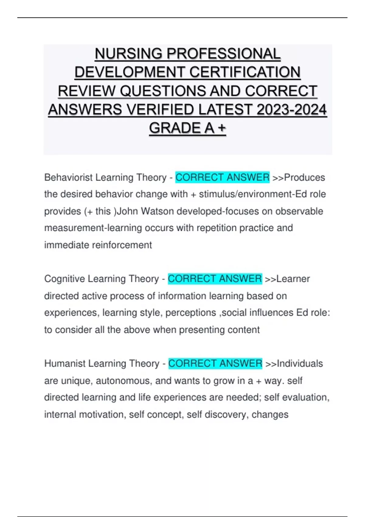 Behaviorist Learning Theory - CORRECT ANSWER >>Produces