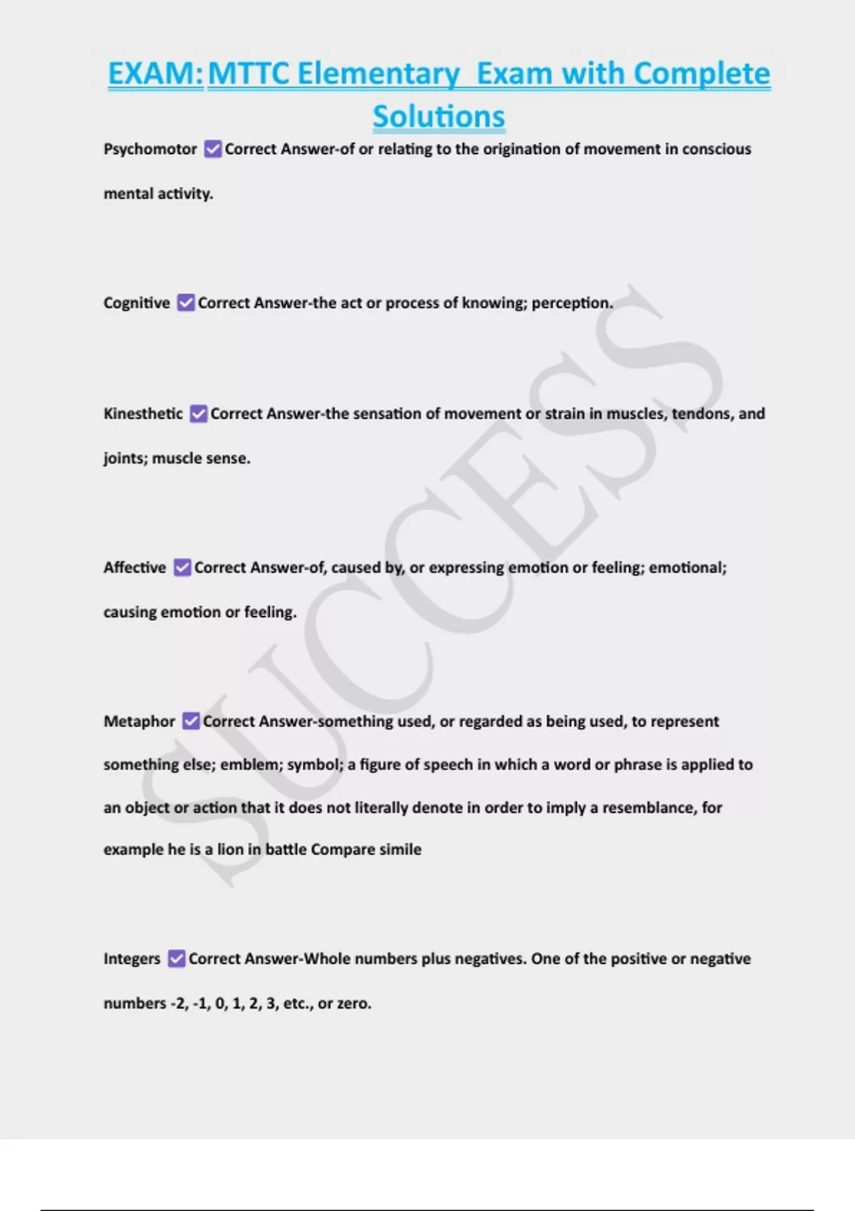 EXAM:MTTC Elementary Exam with Complete Solutions Psychomotor Correct Answer-of or relating to the origination of movement in conscious mental activity. Cognitive Correct Answer-the act or process of knowing; perception. Kinesthetic Correct Answer-the sensation of movement or strain in muscles, tendons, and joints; muscle sense