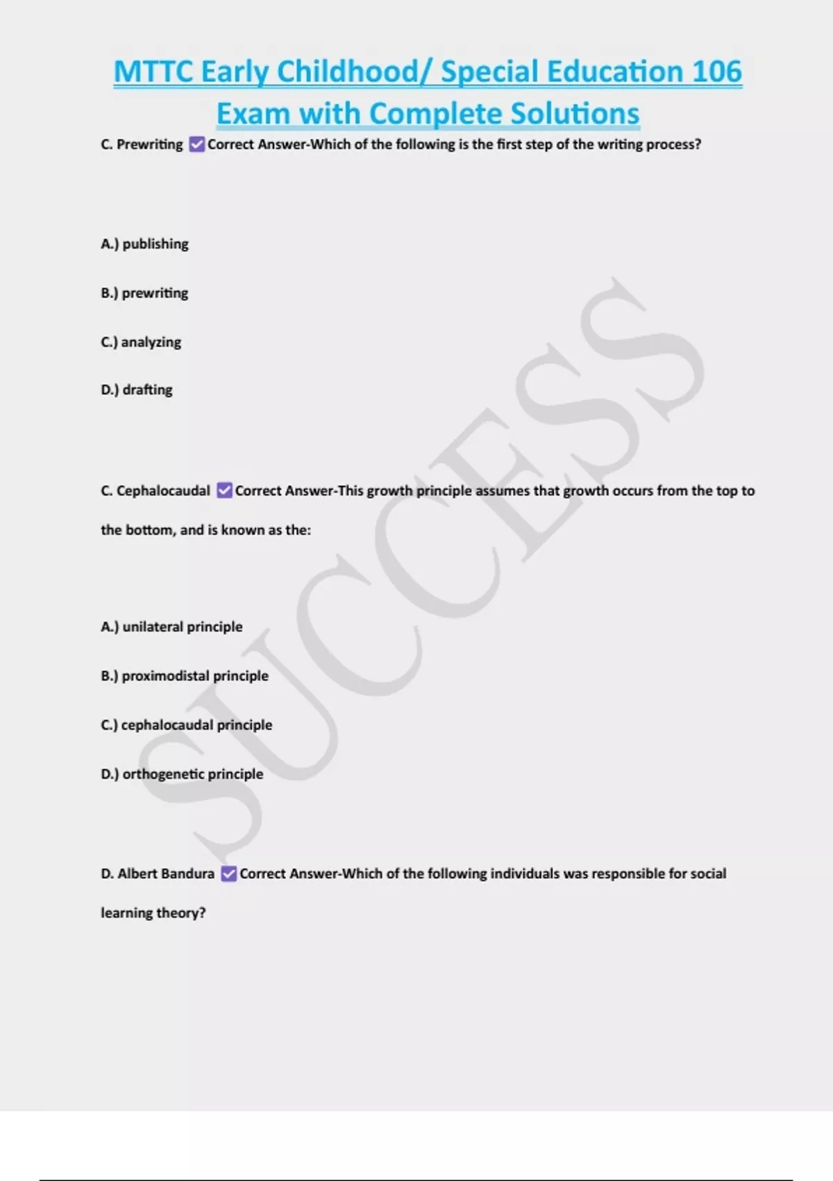 MTTC Early Childhood/ Special Education 106 Exam with Complete Solutions C. Prewriting Correct Answer-Which of the following is the first step of the writing process? A.) publishing B.) prewriting C.) analyzing D.) drafting