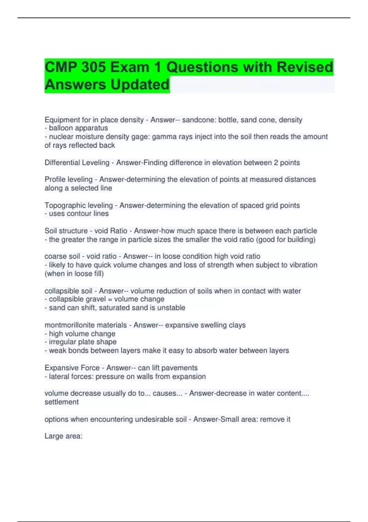 CMP 305 Exam 1 Questions with Revised Answers Updated Equipment for in place density - Answer-- sandcone: bottle, sand cone, density - balloon apparatus - nuclear moisture density gage: gamma rays inject into the soil then reads the amount of rays reflected back Differential Leveling - Answer-Finding difference in elevation between 2 points Profile leveling - Answer-determining the elevation of points at measured distances along a selected line Topographic leveling - Answer-determining the elevation of spaced grid points - uses contour lines Soil structure - void Ratio - Answer-how much space there is between each particle - the greater the range in particle sizes the smaller the void ratio (good for building) coarse soil - void ratio - Answer-- in loose condition high void ratio - likely to have quick volume changes and loss of strength when subject to vibration (when in loose fill) collapsible soil - Answer-- volume reduction of soils when in contact with water - collapsible gravel = volume change - sand can shift, saturated sand is unstable montmorillonite materials - Answer-- expansive swelling clays - high volume change - irregular plate shape - weak bonds between layers make it easy to absorb water between layers