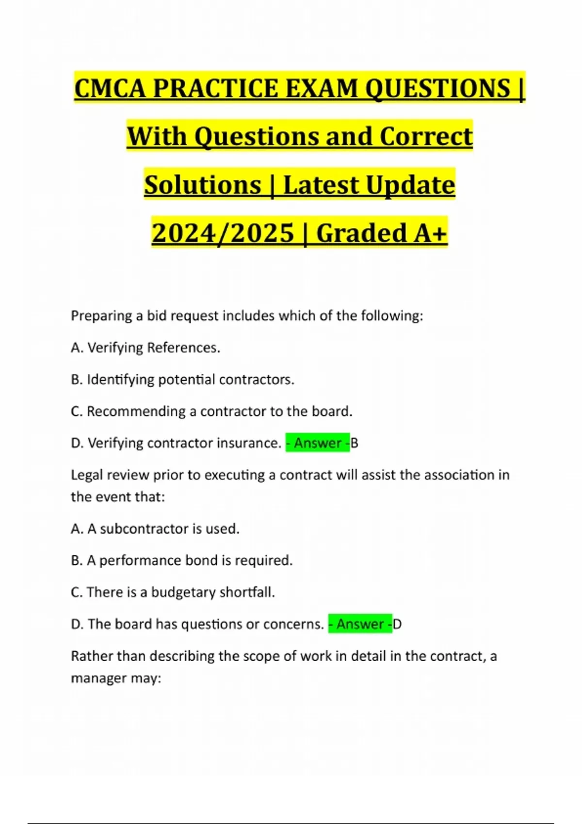 CMCA PRACTICE EXAM QUESTIONS | With Questions and Correct Solutions | Latest Update 2024/2025 | Graded A+ Preparing a bid request includes which of the following: A. Verifying References. B. Identifying potential contractors. C. Recommending a contractor to the board. D. Verifying contractor insurance. - Answer -B Legal review prior to executing a contract will assist the association in the event that: A. A subcontractor is used. B. A performance bond is required. C. There is a budgetary shortfall. D. The board has questions or concerns. - Answer -D Rather than describing the scope of work in detail in the contract, a manager may:A. Attach the bid specifications. B. Call each contractor to describe the job. C. Be on-site to oversee project content. D. Suggest the board meet the