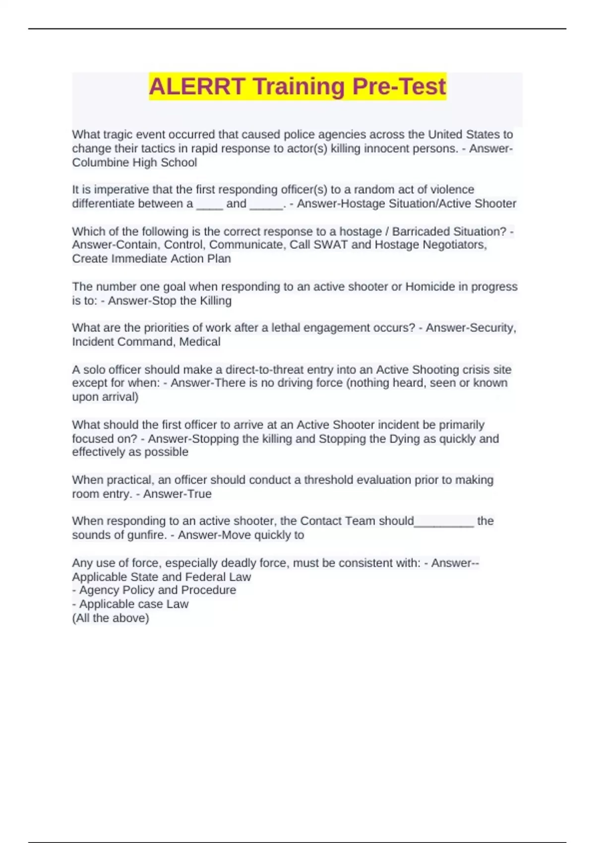 ALERRT Training Pre-Test Questions with correct Answers