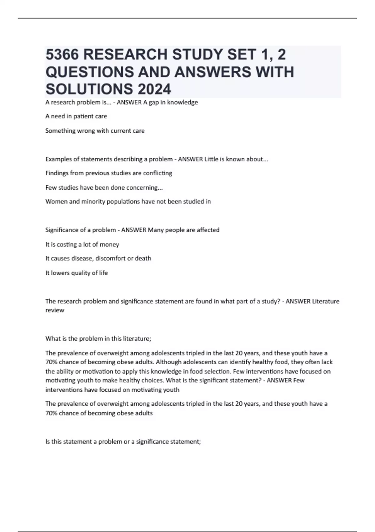 5366 RESEARCH STUDY SET 1, 2 QUESTIONS AND ANSWERS WITH SOLUTIONS 2024