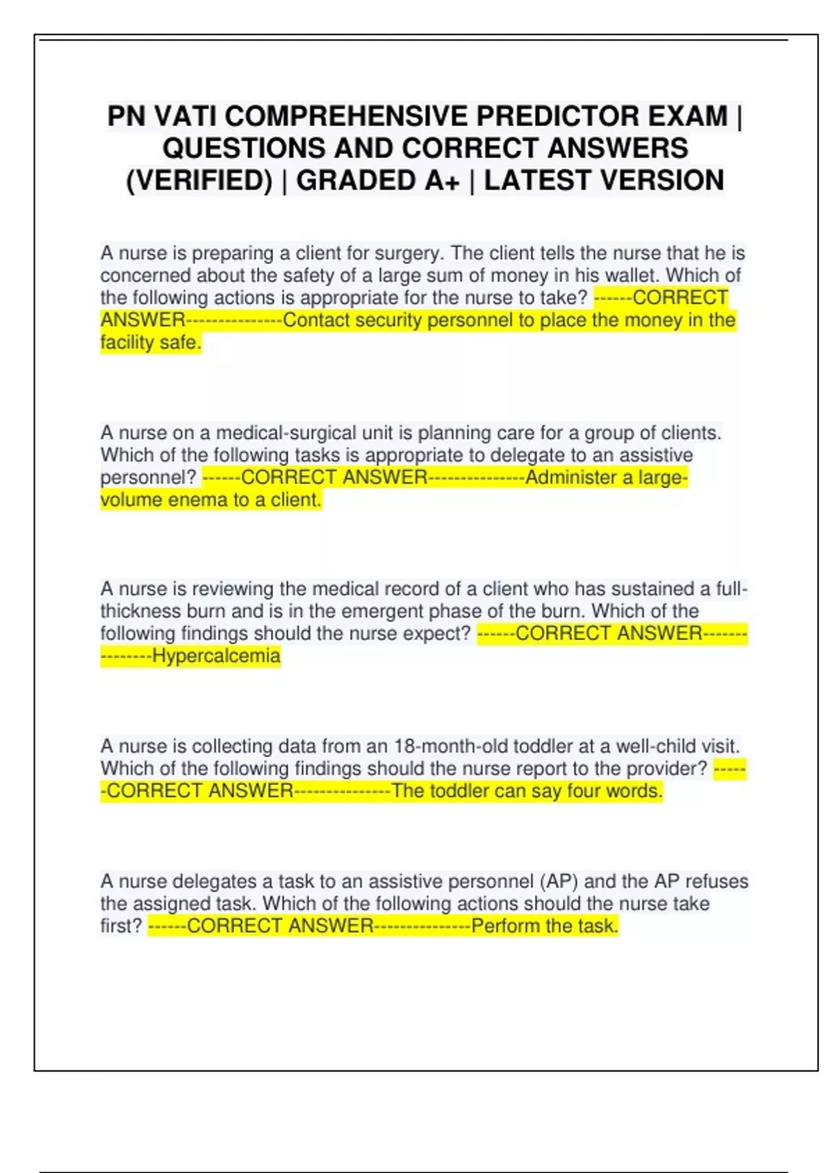 PN VATI COMPREHENSIVE PREDICTOR EXAM | QUESTIONS AND CORRECT ANSWERS (VERIFIED) | GRADED A+ | LATEST VERSION