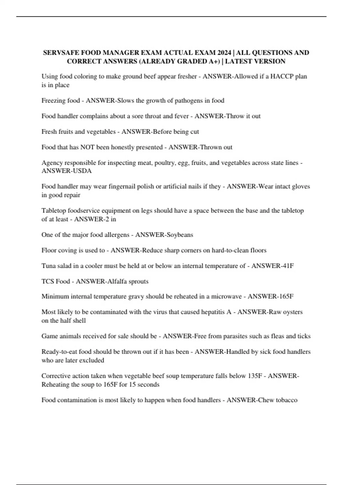 SERVSAFE FOOD MANAGER EXAM ACTUAL EXAM 2024 | ALL QUESTIONS AND