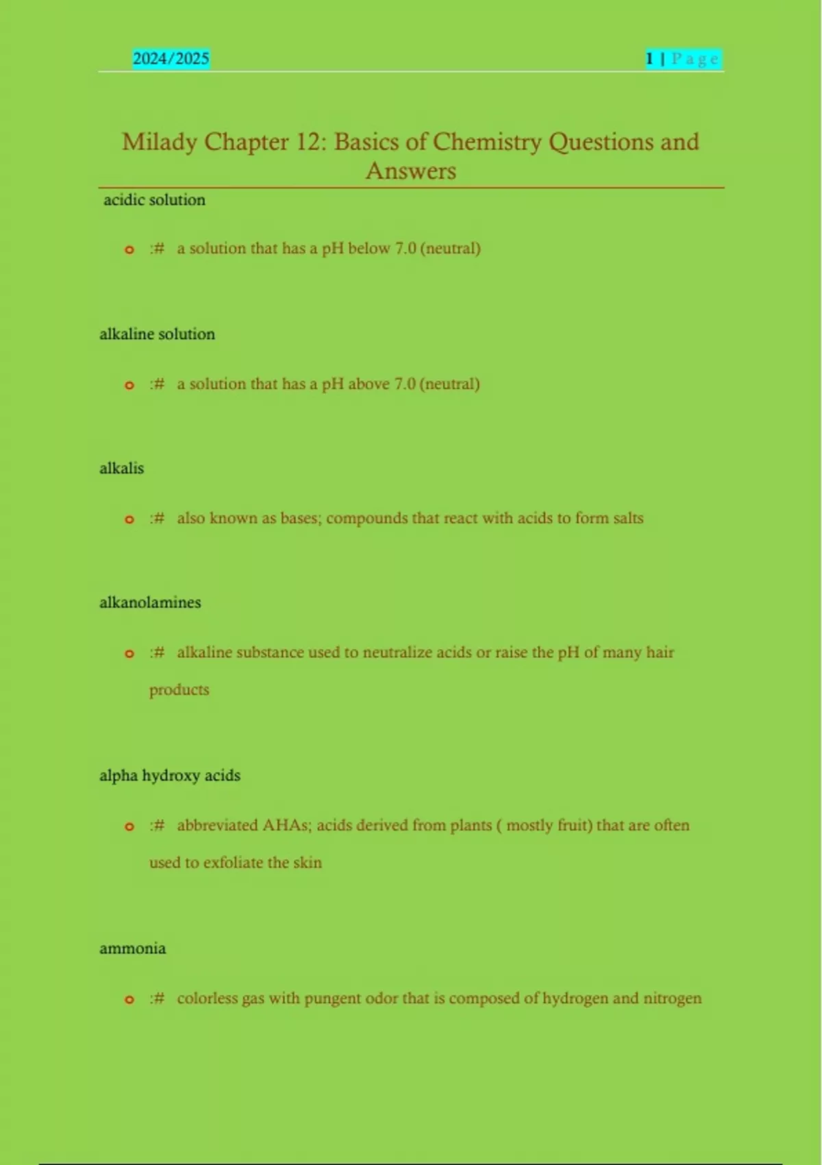 acidic solution o :# a solution that has a pH below 7.0 (neutral) alkaline solution o :# a solution that has a pH above 7.0 (neutral) alkalis o :# also known as bases; compounds that react with acids to form salts alkanolamines o :# alkaline substance used to neutralize acids or raise the pH of many hair products alpha hydroxy acids o :# abbreviated AHAs; acids derived from plants ( mostly fruit) that are often used to exfoliate the skin ammonia o :# colorless gas with pungent odor that is composed of hydrogen and nitrogen 2024/2025 2 | P a g e anion o :# an ion with a negative electrical charge atoms o :# the smallest chemical components ( often called particles) of an element; structures that make up the element and have the same properties of the element cation o :# an ion with a positive electrical charge chemical change o :# a change in the chemical composition or make up of a substance chemical properties o :# characteristics that can only be determined by a chemical reaction and a chemical change in the substance chemistry o :# science that deals with the composition, structures, and properties of matter, and how matter changes under different conditions combustion 2024/2025 3 | P a g e o :# rapid oxidation of a substance, accompanied by the production of heat and light. compound molecules o :# also known as compounds; a chemical combination of two or more atoms of different elements in definite (fixed) proportions element o :# the simplest form of chemical matter; an element can not be broken down into a simpler substance without the loss of identity elemental molecule o :# molecule containing two or more atoms of the same element in definite (fixed) proportions emulsifier o :# an ingredient that brings two normally incompatible materials together and binds them into a uniform and fairly stable blend emulsio