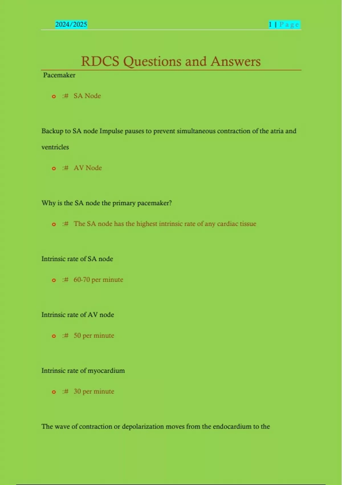 Pacemaker o :# SA Node Backup to SA node Impulse pauses to prevent simultaneous contraction of the atria and ventricles o :# AV Node Why is the SA node the primary pacemaker? o :# The SA node has the highest intrinsic rate of any cardiac tissue Intrinsic rate of SA node o :# 60-70 per minute Intrinsic rate of AV node o :# 50 per minute Intrinsic rate of myocardium o :# 30 per minute The wave of contraction or depolarization moves from the endocardium to the 2024/2025 2 | P a g e o :# epicardium What is absolute refractory state? o :# that period when a muscle cell is not excitable from phase 1 into phase 3 the relative refractory period is during phase 3 and the muscle cell might contract if the stimulus is strong Depolarization equals o :# Contraction Repolarization equals o :# relaxation P wave represents o :# artrial systole P-R interval represents o :# from atrial to ventricular depolarization QRS complex represents 2024/2025 3 | P a g e o :# ventricular systole T wave represents o :# ventricular diastole- repolarization What is the normal duration for the QRS complex? o :# less than 0.12 seconds What is the frank-starling law? o :# Increased volume-preload- equals increased contractility increased myocardial fiber length equals increased tension or Rubber Band theory Stroke volume increases in response to an o :# increase in the volume of blood filling the heart or end diastolic volume The greater the preload the greater o :# the force of contraction-frank starling Law Reasons for increased preload o :# Regurgitation in all valves, ventricular and atrial septal defects, and fluid overloa