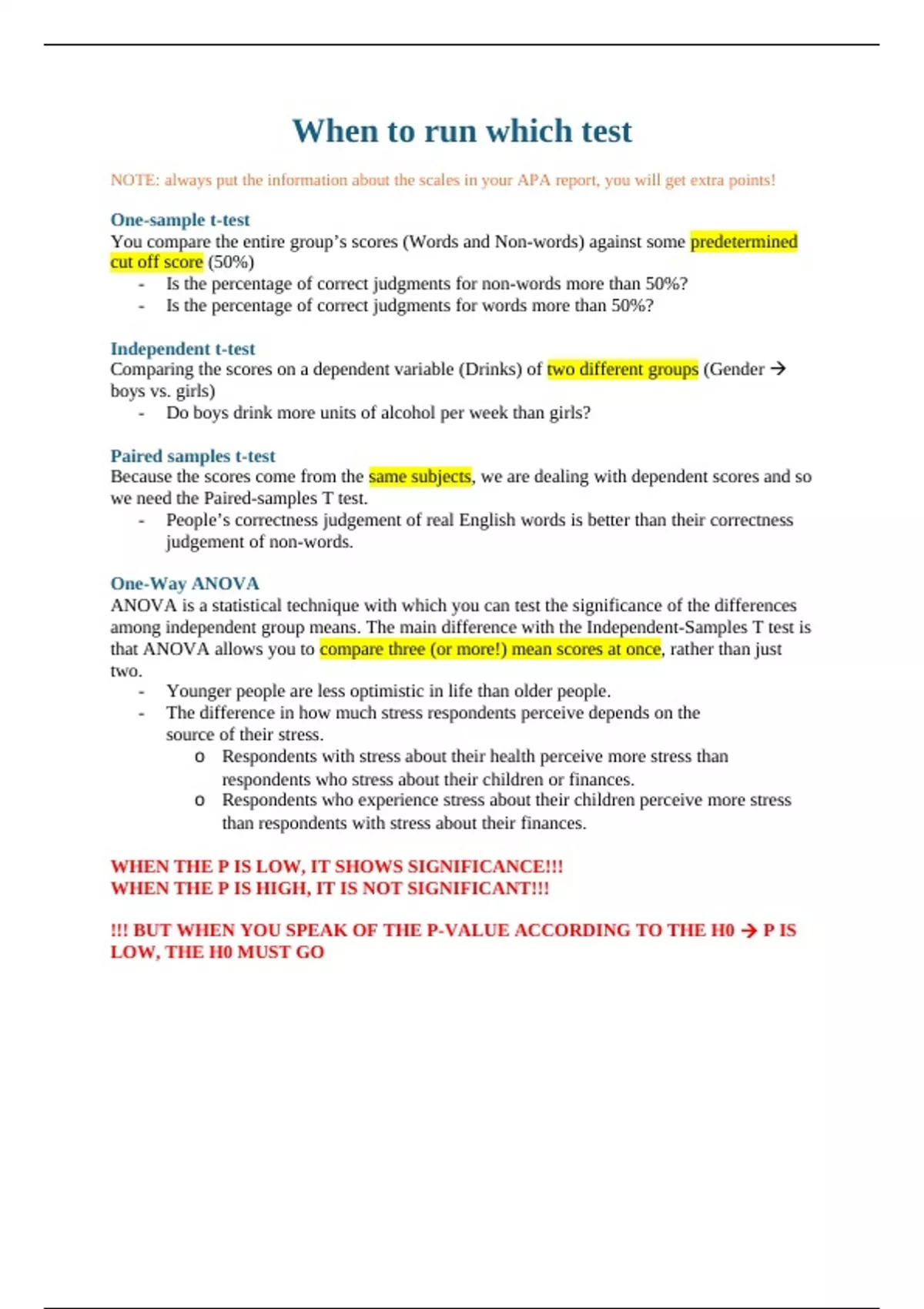 This document includes a Statistics Bible on how to perform all the steps in Jamovi. When to choose which test, step-by-step explanation on how to in Jamovi, notes on what to look out for etc. The midterm document includes: One-sample, independent, paired samples t-test and One Way ANOVA.
