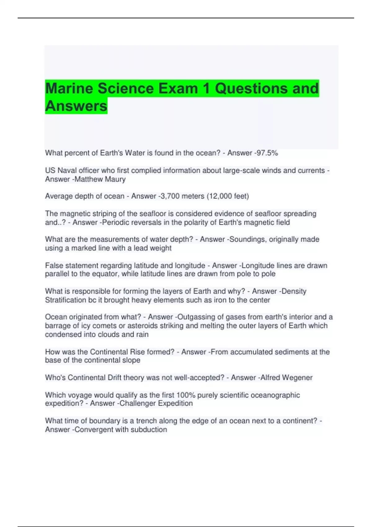 Marine Science Exam 1 Questions and Answers 2024