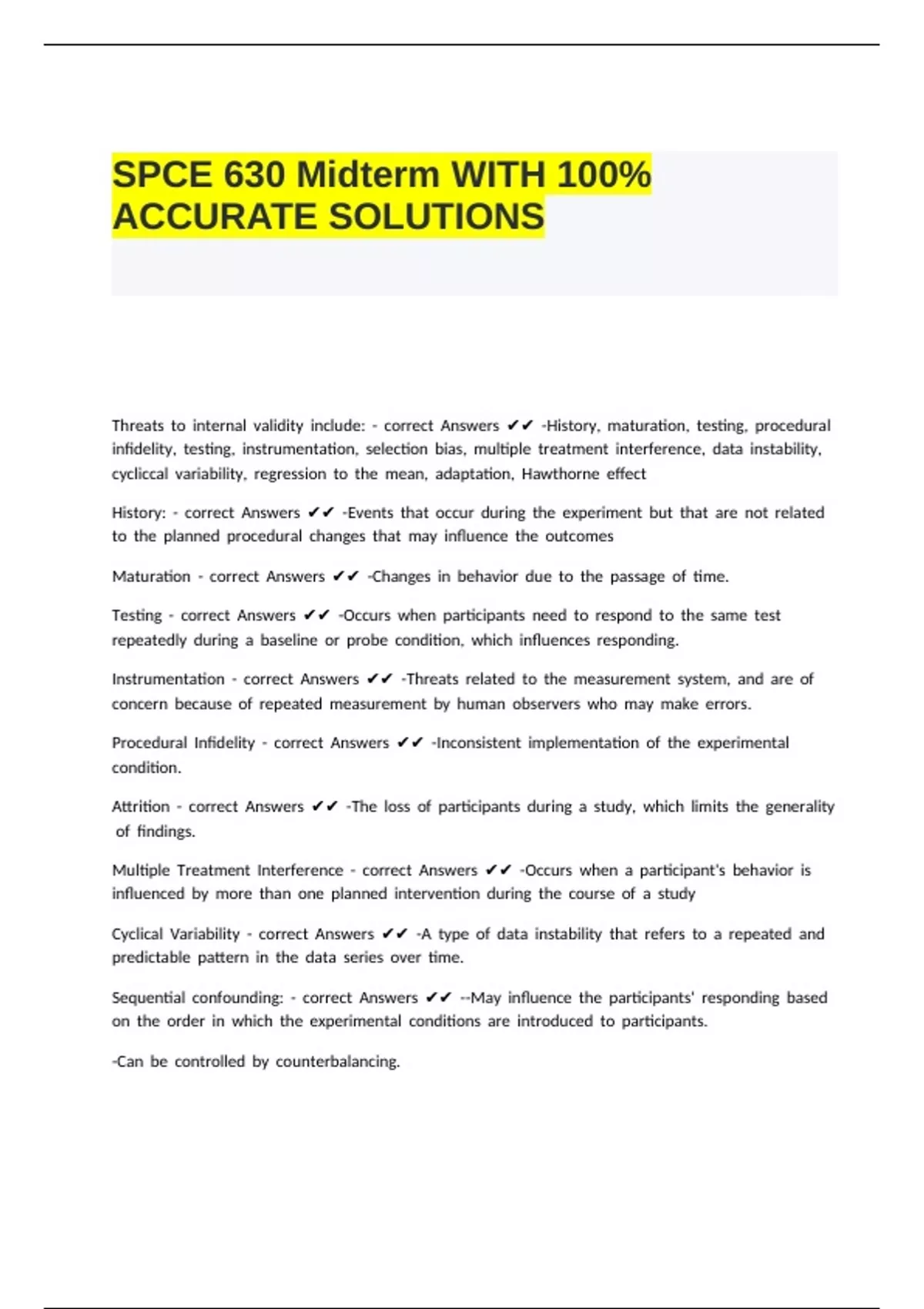Threats !to !internal !validity !include: !- !correct !Answers !✔✔ !-History, !maturation, !testing, !procedural !