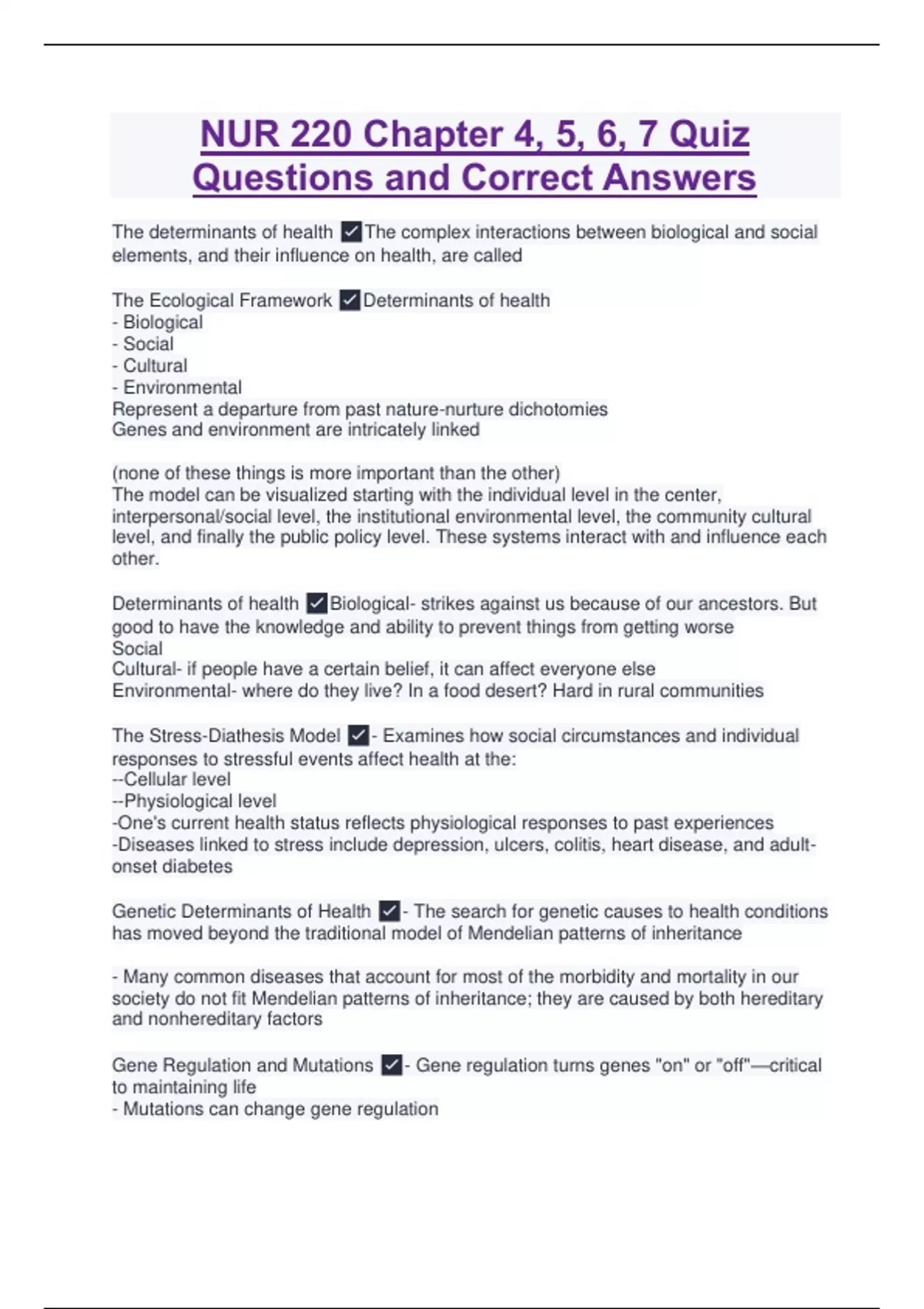 The determinants of health The complex interactions between biological and social elements, and their influence on health, are called The Ecological Framework Determinants of health - Biological - Social - Cultural - Environmental Represent a departure from past nature-nurture dichotomies Genes and environment are intricately linked (none of these things is more important than the other) The model can be visualized starting with the individual level in the center, interpersonal/social level, the institutional environmental level, the community cultural level, and finally the public policy level. These systems interact with and influence each other. Determinants of health Biological- strikes against us because of our ancestors. But good to have the knowledge and ability to prevent things from getting worse Social Cultural- if people have a certain belief, it can affect everyone else Environmental- where do they live? In a food desert? Hard in rural communities The Stress-Diathesis Model - Examines how social circumstances and individual responses to stressful events affect health at the: --Cellular level --Physiological level -One's current health status reflects physiological responses to past experiences -Diseases linked to stress include depression, ulcers, colitis, heart disease, and adult-onset diabetes Genetic Determinants of Health - The search for genetic causes to health conditions has moved beyond the traditional model of Mendelian patterns of inheritance - Many common diseases that account for most of the morbidity and mortality in our society do not fit Mendelian patterns of inheritance; they are caused by both hereditary and nonhereditary factors Gene Regulation and Mutations - Gene regulation turns genes "on" or "off"—critical to maintaining life - Mutations can change gene regulation