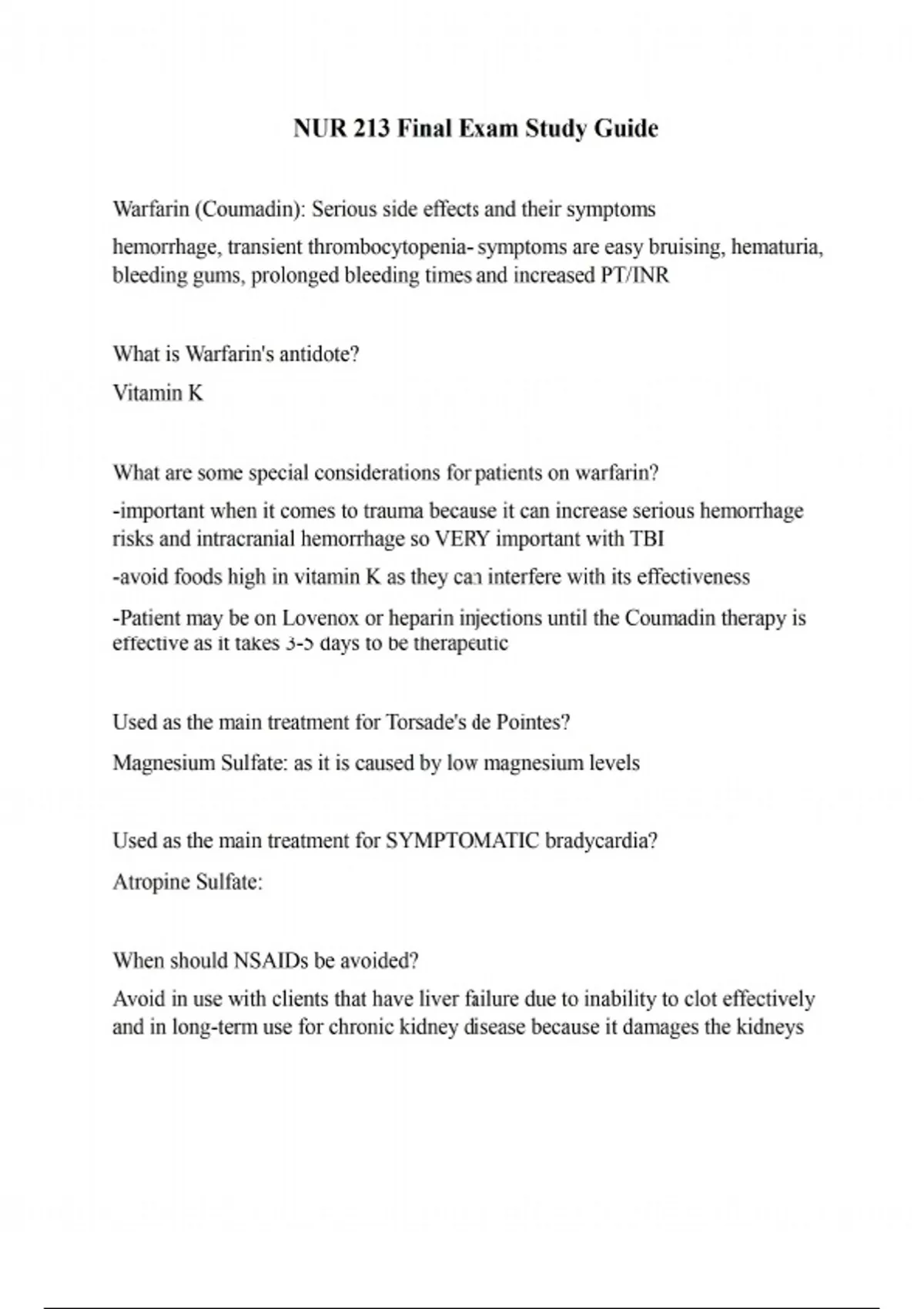 Warfarin (Coumadin): Serious side effects and their symptoms hemorrhage, transient thrombocytopenia- symptoms are easy bruising, hematuria, bleeding gums, prolonged bleeding times and increased PT/INR What is Warfarin's antidote? Vitamin K What are some special considerations for patients on warfarin? -important when it comes to trauma because it can increase serious hemorrhage risks and intracranial hemorrhage so VERY important with TBI -avoid foods high in vitamin K as they can interfere with its effectiveness -Patient may be on Lovenox or heparin injections until the Coumadin therapy is effective as it takes 3-5 days to be therapeutic Used as the main treatment for Torsade's de Pointes? Magnesium Sulfate: as it is caused by low magnesium levels Used as the main treatment for SYMPTOMATIC bradycardia? Atropine Sulfate: When should NSAIDs be avoided? Avoid in use with clients that have liver failure due to inability to clot effectively and in long-term use for chronic kidney disease because it damages the kidneys Preferred treatment for when a patient first convert to AFIB/AFLUTTER? synchronized defibrillated cardioversion Used as a second option for cardioversion when patients first convert to AFIB/AFLUTTER- Risks? Adenosine: can cause dysrhythmias and stop the heart- Metronidazole: Serious side effects: Seizures Leukopenia (infection, low white blood cell counts) Peripheral neuropathy (numbness and tingling in the hands and feet) Naloxone is used for what? -Treat respiratory depression and other emergency side effects for narcotics like oxycodone, morphine, and dilaudid -Unintentional injury like poisoning with these substances nurses would prepare to administer this to save their clients life- What is one of the most serous side effects of Naloxone? seizures Methylprednisone: Serious side effects Peptic ulcer (gnawing stomach pain especially between meals) Hypocalcemia (muscle cramping) Osteoporosis (easy bones breaking) Muscle loss (muscle pain, weakness, and wasting)