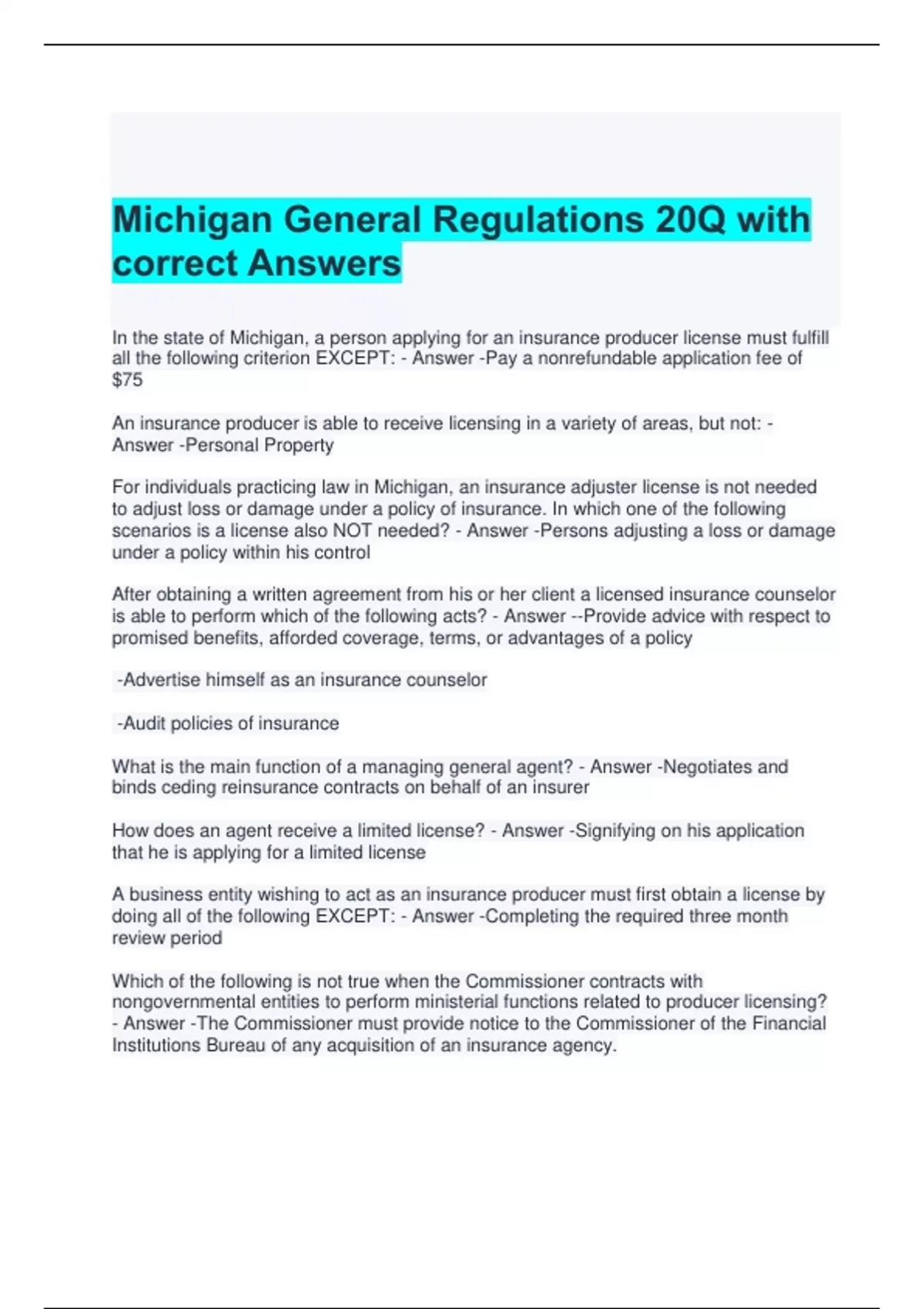 Michigan General Regulations 20Q with correct Answers