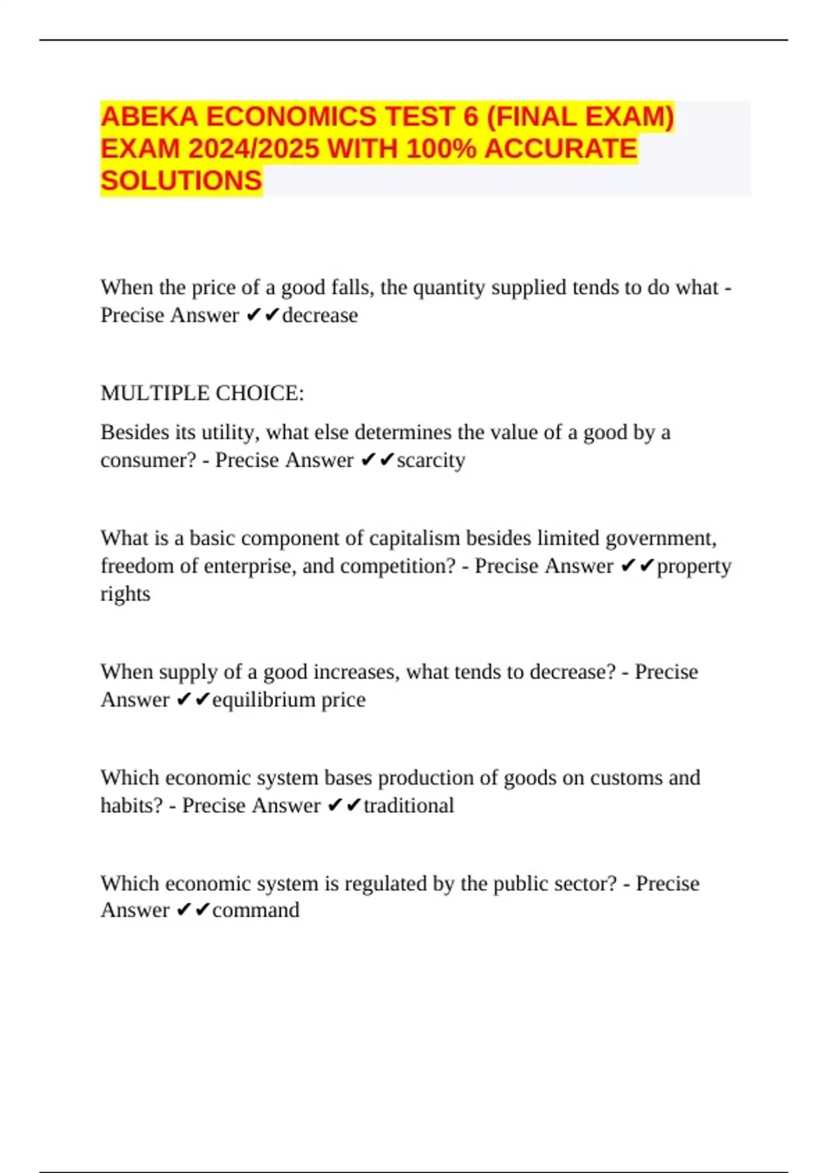 ABEKA ECONOMICS TEST 6 (FINAL EXAM) EXAM 2024/2025 WITH 100% ACCURATE SOLUTIONS