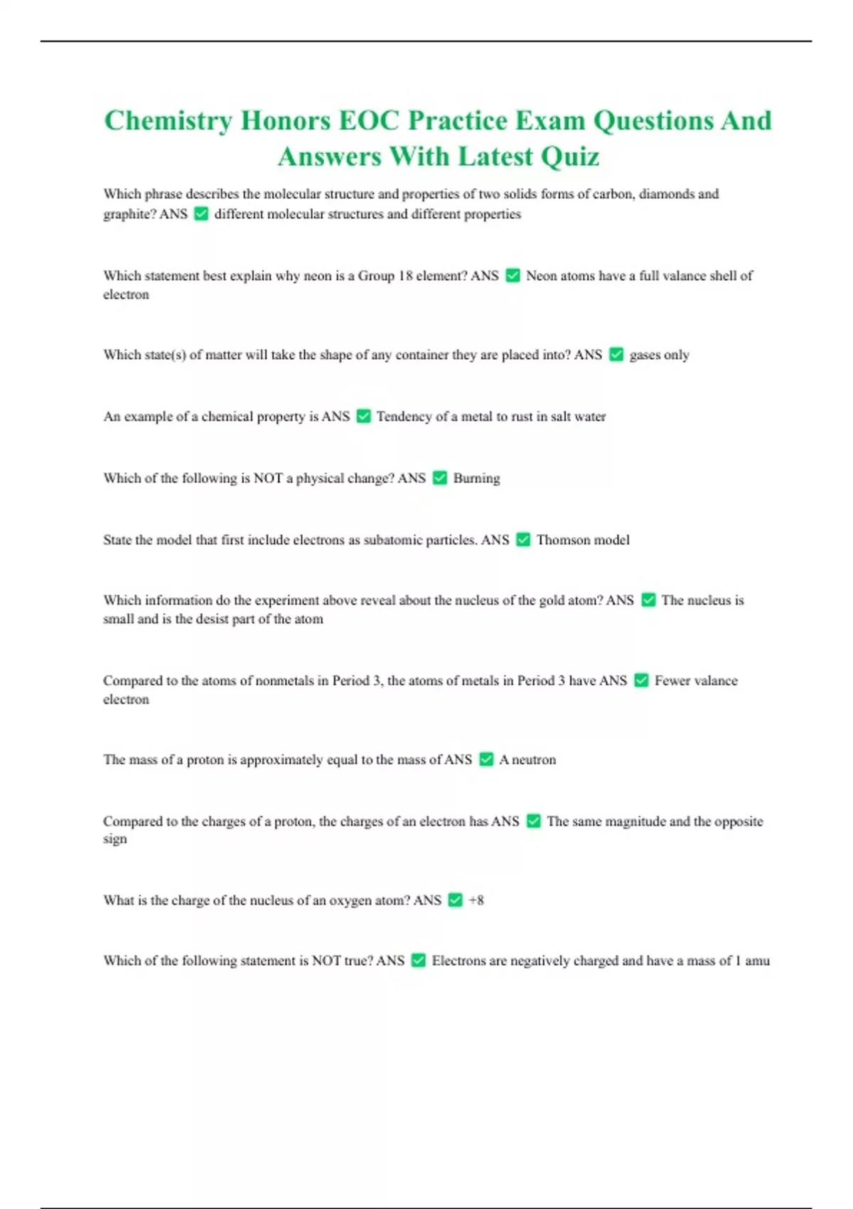 Chemistry Honors EOC Practice Exam Questions And Answers With Latest Quiz Which phrase describes the molecular structure and properties of two solids forms of carbon, diamonds and graphite? ANS different molecular structures and different properties Which statement best explain why neon is a Group 18 element? ANS Neon atoms have a full valance shell of electron Which state(s) of matter will take the shape of any container they are placed into? ANS gases only An example of a chemical property is ANS Tendency of a metal to rust in salt water