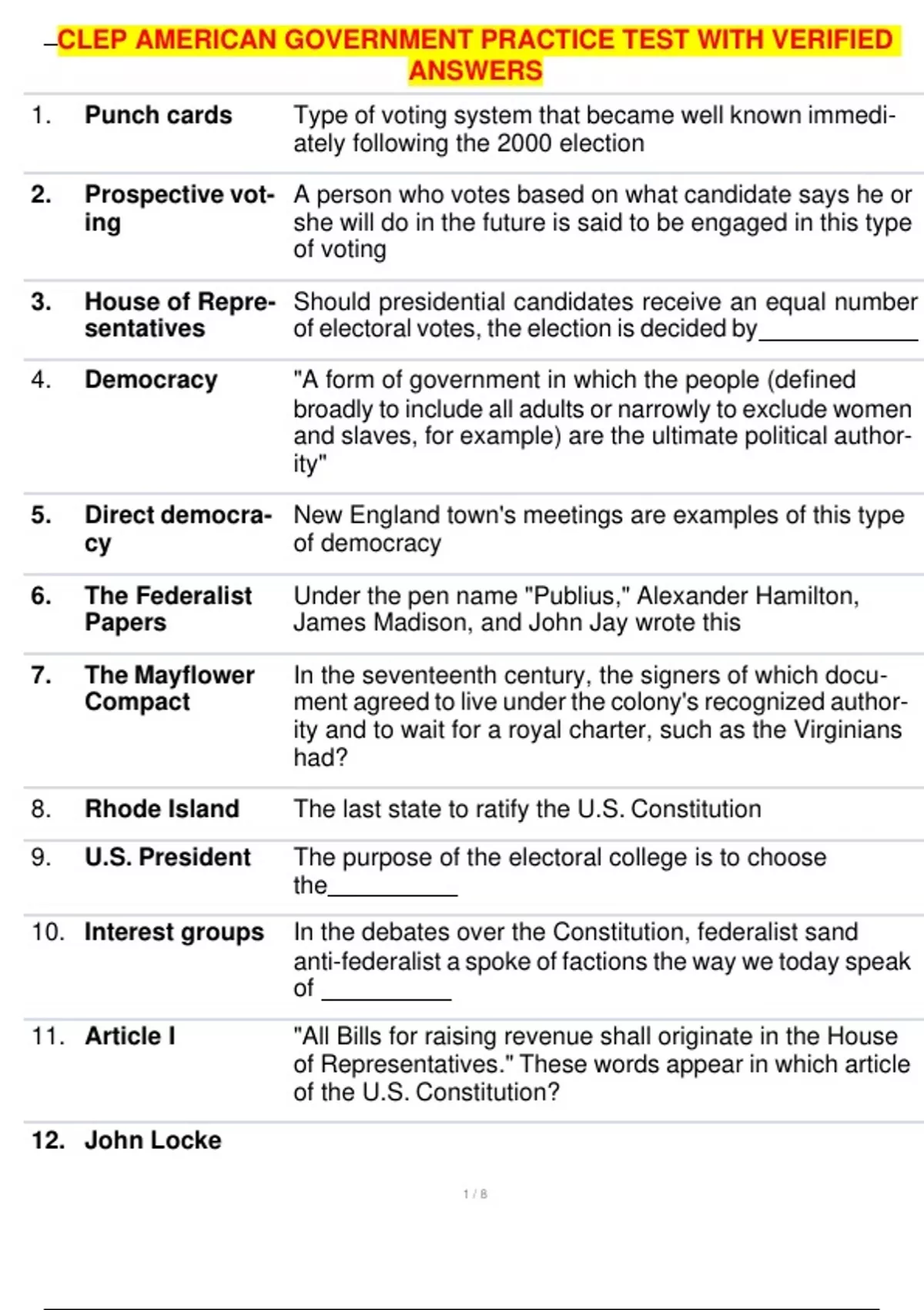 , CLEP AMERICAN GOVERNMENT PRACTICE TEST WITH VERIFIED