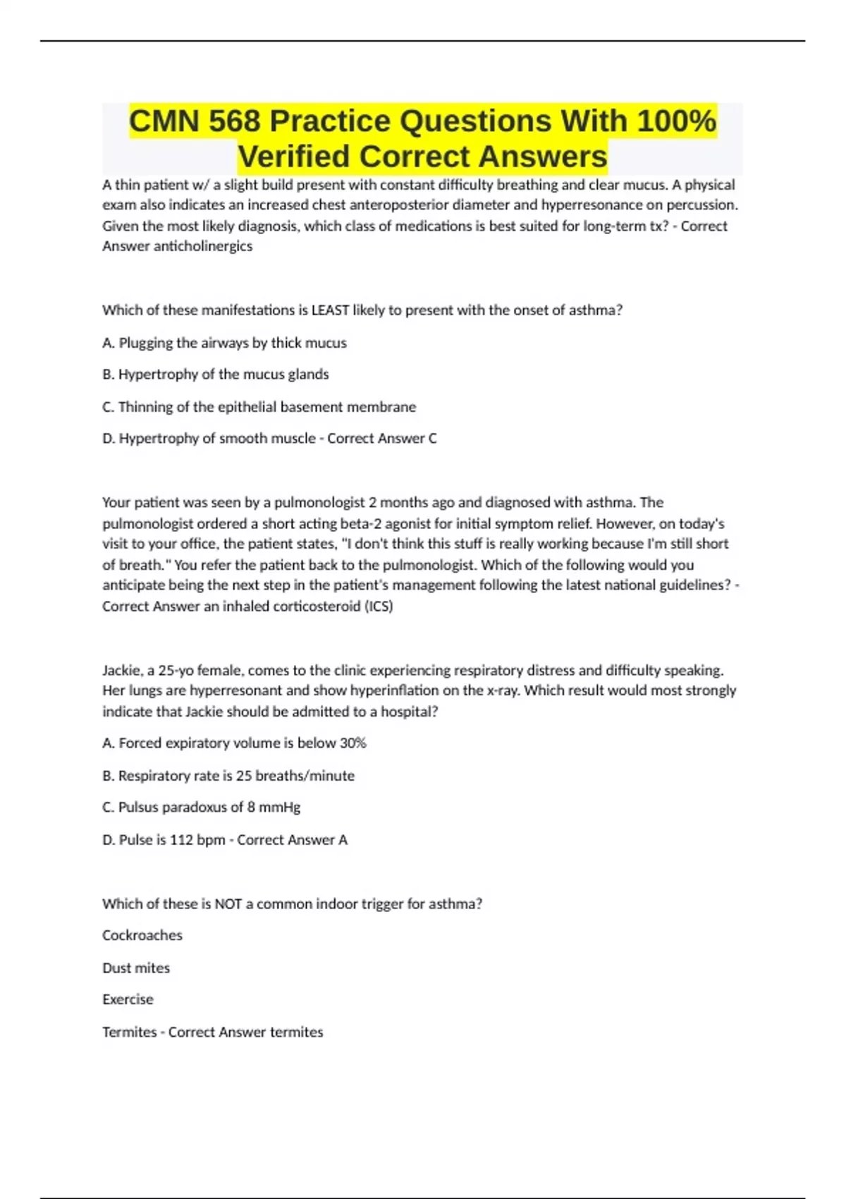 CMN 568 Practice Questions With 100% Verified Correct Answers A thin patient w/ a slight build present with constant difficulty breathing and clear mucus. A physical exam also indicates an increased chest anteroposterior diameter and hyperresonance on percussion. Given the most likely diagnosis, which class of medications is best suited for long-term tx? - Correct Answer anticholinergics Which of these manifestations is LEAST likely to present with the onset of asthma? A. Plugging the airways by thick mucus B. Hypertrophy of the mucus glands C. Thinning of the epithelial basement membrane D. Hypertrophy of smooth muscle - Correct Answer C Your patient was seen by a pulmonologist 2 months ago and diagnosed with asthma. The pulmonologist ordered a short acting beta-2 agonist for initial symptom relief. However, on today's visit to your office, the patient states, "I don't think this stuff is really working because I'm still short of breath." You refer the patient back to the pulmonologist. Which of the following would you anticipate being the next step in the patient's management following the latest national guidelines? - Correct Answer an inhaled corticosteroid (ICS) Jackie, a 25-yo female, comes to the clinic experiencing respiratory distress and difficulty speaking. Her lungs are hyperresonant and show hyperinflation on the x-ray. Which result would most strongly indicate that Jackie should be admitted to a hospital? A. Forced expiratory volume is below 30% B. Respiratory rate is 25 breaths/minute C. Pulsus paradoxus of 8 mmHg D. Pulse is 112 bpm - Correct Answer A Which of these is NOT a common indoor trigger for asthma? Cockroaches Dust mites Exercise Termites - Correct Answer termites Upon exam