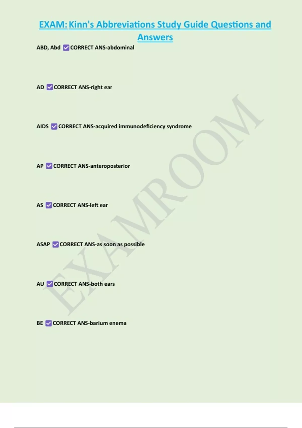,EXAM: Kinn's Abbreviations Study Guide Questions and