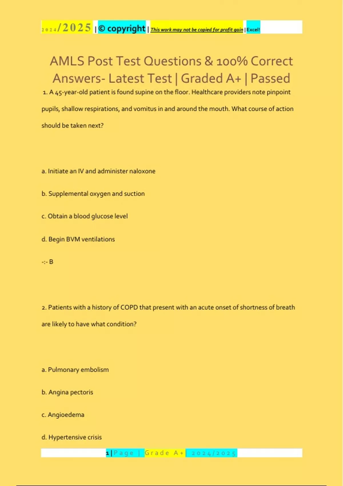 1. A 45-year-old patient is found supine on the floor. Healthcare providers note pinpoint pupils, shallow respirations, and vomitus in and around the mouth. What course of action should be taken next? a. Initiate an IV and administer naloxone b. Supplemental oxygen and suction c. Obtain a blood glucose level d. Begin BVM ventilations -:- B 2. Patients with a history of COPD that present with an acute onset of shortness of breath are likely to have what condition? a. Pulmonary embolism b. Angina pectoris c. Angioedema d. Hypertensive crisis 2 0 2 4 / 2 0 2 5 | © copyright | This work may not be copied for profit gain | Excel! 2 | P a g e | G r a d e A + | 2 0 2 4 / 2 0 2 5 -:- A 3. During compensatory shock, the renin-angiotensin-aldosterone system is activated to cause a/an: a. Increase in preload, afterload, and re-absorption of sodium b. Decrease in preload, afterload, and re-absorption of sodium c. Hypotension and bradycardia d. Vasodilation and sodium retention -:- A 4. What clinical findings are most commonly associated with a pulmonary embolus? a. Clear breath sounds with tachypnea b. Rhonchi auscultated bilaterally with hypercarbia c. Crackles heard in the bases with bradycardia d. Fever, tachycardia, and tachypnea with increased work of breathing -:- A 2 0 2 4 / 2 0 2 5 | © copyright | This work may not be copied for profit gain | Excel! 3 | P a g e | G r a d e A + | 2 0 2 4 / 2 0 2 5 5. What condition is most likely to cause respiratory acidosis? a. Anxiety/panic attack b. Narcotic overdose c. Methanol ingestion d. Diabetic ketoacidosis -:- B 6. A 55-year-old complains of an 'aching' chest discomfort that persists over several days. The patient has a temperature of 101F (38.3C). Which finding will help narrow the diagnosis to pericarditis? a. Pain is relieved when supine b. Pulsus alternans is present c. S3 gallop is auscultated