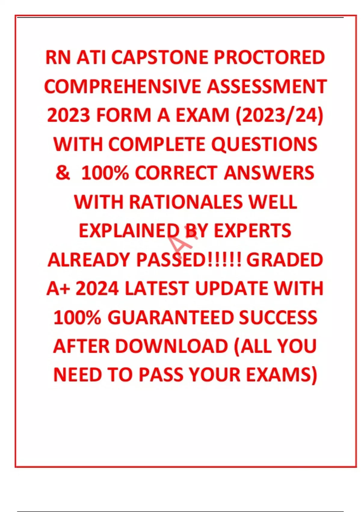 RN ATI CAPSTONE PROCTORED COMPREHENSIVE ASSESSMENT 2023 FORM A EXAM (2023/24) WITH COMPLETE QUESTIONS & 100% CORRECT ANSWERS WITH RATIONALES WELL EXPLAINED BY EXPERTS ALREADY PASSED!!!!! GRADED A+ 2024 LATEST UPDATE WITH 100% GUARANTEED SUCCESS AFTER DO