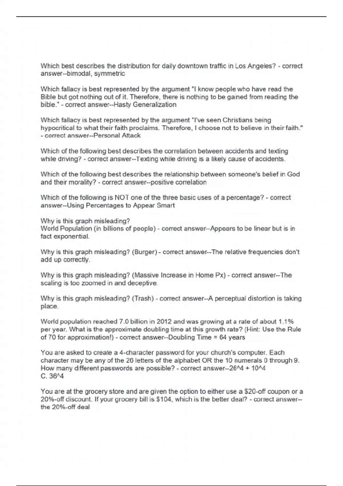 MATH120: Final Exam Questions and Answers 2024 _________ (or equity) gives you a share of ownership in a company. - correct answer- Stock ________________ are expenses that Congress must vote on each year and that the President must sign into law. - correct answer--Discretionary outlays _________________ is interest paid only on the original investment and NOT on any interest added at later dates. - correct answer--Simple interest ____________________ is a measure of how widely data values are spread out about the center of a distribution. - correct answer--Variation A ________________ is a deceptive argument in which the conclusion is not well supported by the premises. - correct answer--fallacy A box contains 20 chocolates, but only 2 of them are the dark chocolate you like. When we say that the probability of drawing one of the dark chocolates at random is 0.1, what type of probability are are we stating? - correct answer--a theoretical probability A home mortgage of $150,000 has a fixed APR of 5% for 15 years. Calculate the monthly payment needed to pay off the loan. - correct answer--$1186.19 A hose fills a hot spring pool at a rate of 5.6 gallons per minute. How many hours will it take to fill a 450-gallon hot tub? - correct answer--1.34 hours A loan that you pay off with equal regular payments is called a(n) ________ (or amortized loan). - correct answer--installment loan A low-risk strategy for the lender of a loan is a(n) _______________, in which the interest rate you pay changes whenever prevailing rates change. - correct answer- adjustable rate mortgage (ARM) A store is having a "25% off" sale. How does an item's sale price compare to its original price? - correct answer--75% of its original A(n) _______________ makes a case for a specific conclusion from more general premises. - correct answer--deductive argument According to the figure, the equilibrium price and quantity are (Supply and Demand) - correct answer--P = $20; Q = 600 According to the graph, roughly what fraction of the world identifies as Christian? (Pie Chart) - correct answer--one-third According to the graph, what is percent DIFFERENCE between the greatest generation and the millennial generation in those who pray daily during the late 2000's period? (Daily Prayer, by Generation) - correct answer--33% Actual lengths of pregnancy terms are nearly normally distributed about a mean pregnancy length of 38.5 weeks with a standard deviation of 15 days (2.14 weeks). What is the z-score of a woman with 36 weeks of pregnancy? - correct answer---1.17 All lines that are parallel in the real scene and perpendicular to the canvas must intersect at the _____________________ of the painting. - correct answer--principal vanishing point All musical sounds have a wave pattern that can represented as - correct answer--the sum of one or more individual constant-frequency waves. An insurance policy sells for $1000. Based on past data, an average of 1 in 50 policyholders will file a $10,000 claim, an average of 1 in 100 policyholders will file for a $25,000 claim, and an average of 1 in 250 policyholders will file a $60,000 claim. What is the expected value (to the company) per policy sold. - correct answer--$310 An opinion poll finds that 64% of 1,069 people surveyed said that the President was doing a good job. How many said the President is doing a good job? - correct answer- 684 Assume your business has fixed costs totaling $1,374,000 in which you cannot alter in the short term. If you charge $250 per person at your resort, but spend roughly $75 per person on meals, lodging, and literature, what amount of people must you bring in per year to break-even and cover your costs? - correct answer--7,852 people Average human body temperature is 98.6 F. What is it in Celsius? (Hint: use the formula C = (5/9)(F - 32) as means of converting.) - correct answer--37.0 C Calvin isn't rich, but he gets by, and he loves sitting down for a latte at the college coffee shop. With tax and tip, he usually spends $5 on his large latte. He gets at least one a day (on average), and about every three days he has a second one. He figures it's not such a big indulgence. Roughly how much is he spending on coffee per year? - correct answer--$2,430 Carol earns 50% more than William. How many times larger is her income than his? - correct answer--1.5 times