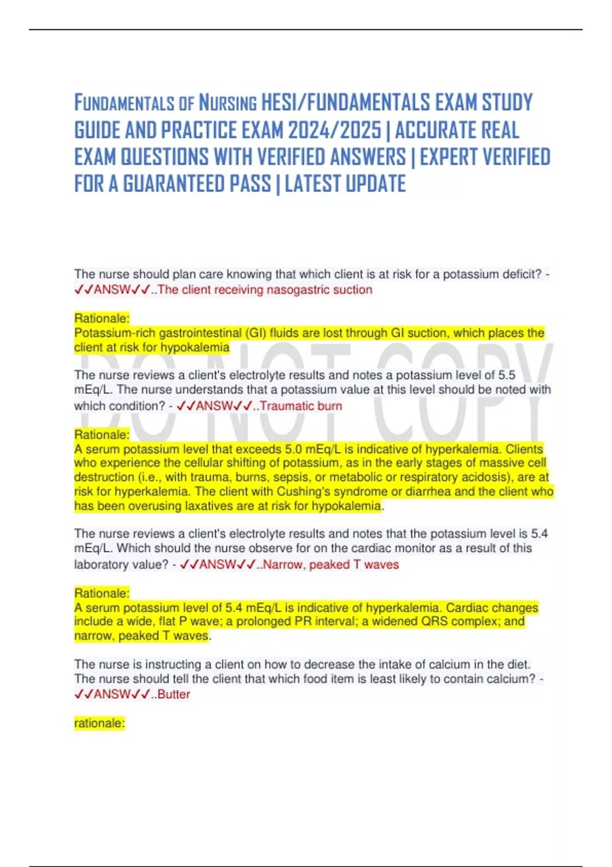 FUNDAMENTALS OF NURSING HESI/FUNDAMENTALS EXAM STUDY GUIDE AND PRACTICE EXAM 2024/2025 | ACCURATE REAL EXAM QUESTIONS WITH VERIFIED ANSWERS | EXPERT VERIFIED FOR A GUARANTEED PASS | LATEST UPDATE