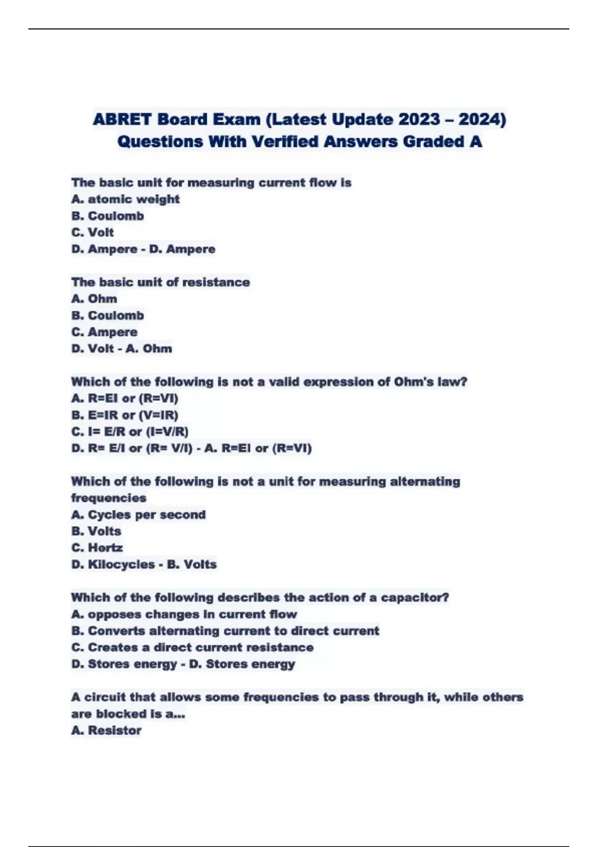 ABRET Board Exam (Latest Update 2024 – 2025) Questions With Verified Answers Graded A
