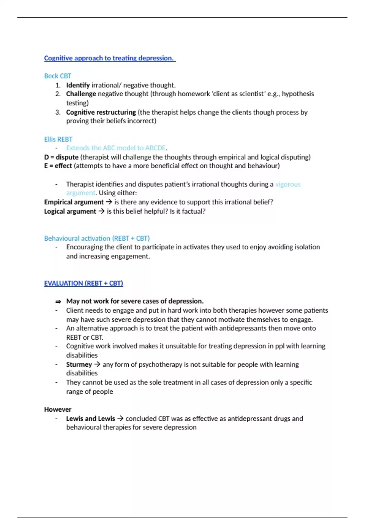 - Lewis and Lewis  concluded CBT was as effective as antidepressant drugs and