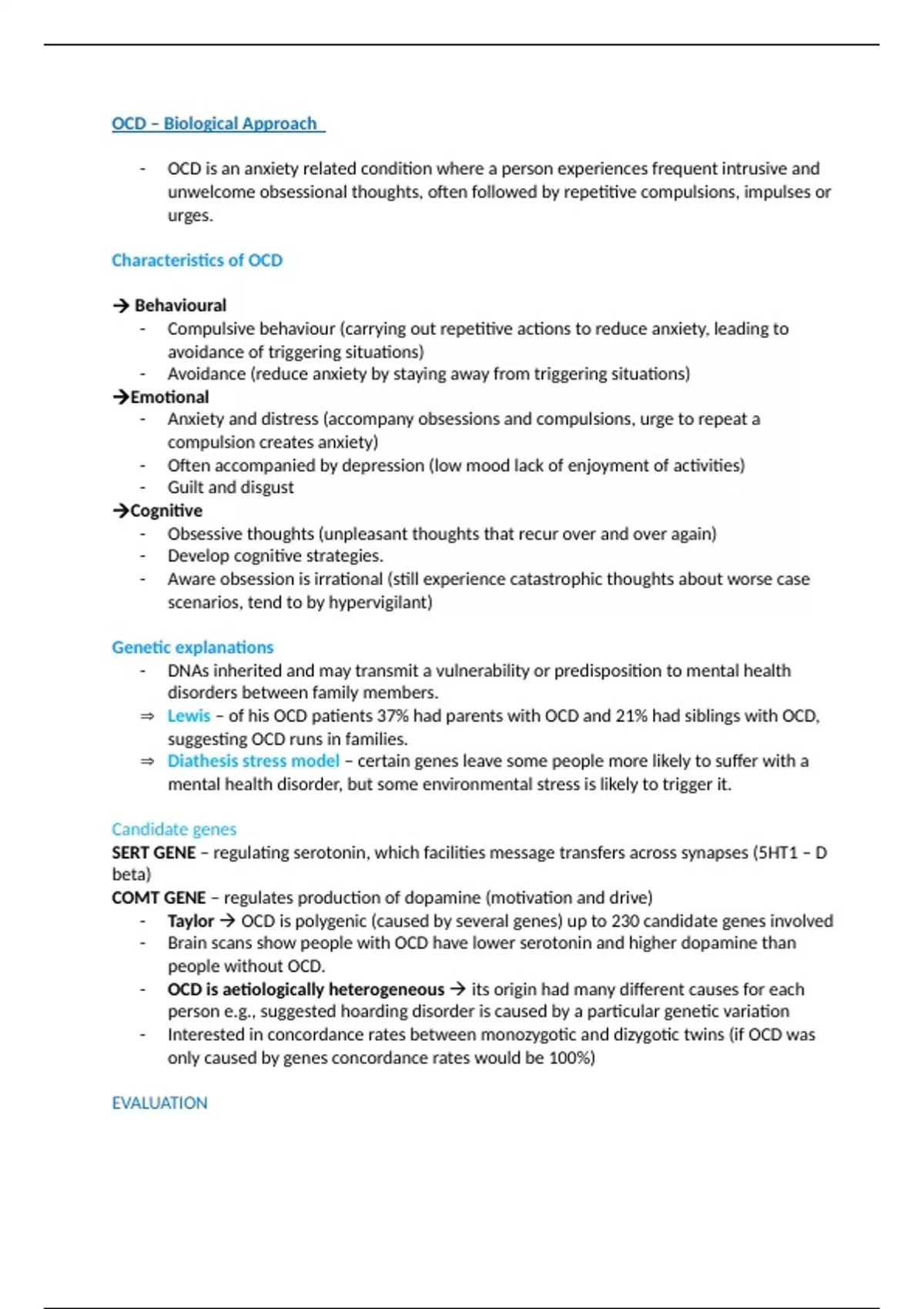 - Taylor  OCD is polygenic (caused by several genes) up to 230 candidate genes involved