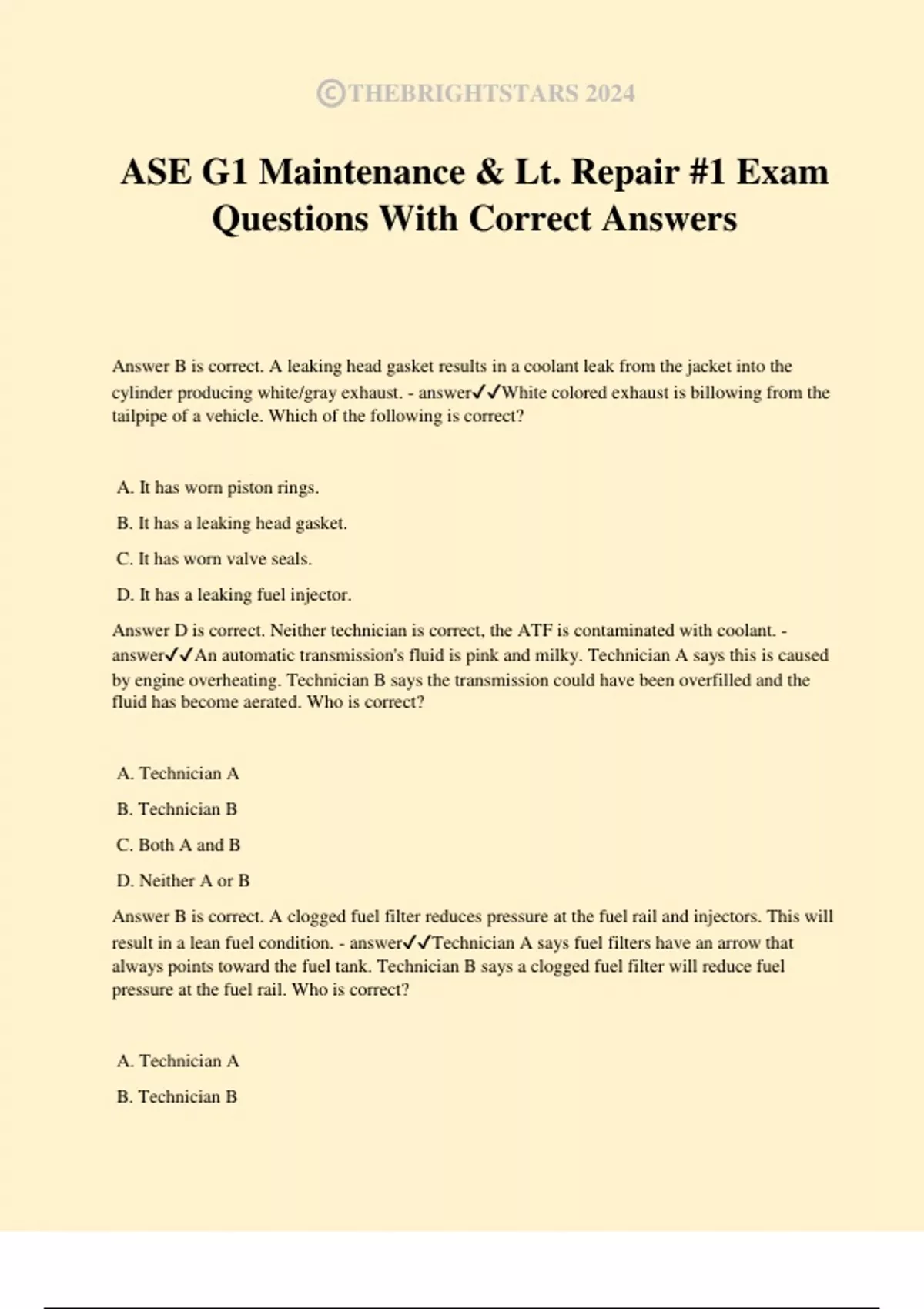 ASE G1 Maintenance & Lt. Repair #1 Exam Questions With Correct Answers Answer B is correct. A leaking head gasket results in a coolant leak from the jacket into the cylinder producing white/gray exhaust. - answerWhite colored exhaust is billowing from the tailpipe of a vehicle. Which of the following is correct? A. It has worn piston rings. B. It has a leaking head gasket. C. It has worn valve seals. D. It has a leaking fuel injector. Answer D is correct. Neither technician is correct, the ATF is contaminated with coolant. - answerAn automatic transmission's fluid is pink and milky. Technician A says this is caused by engine overheating. Technician B says the transmission could have been overfilled and the fluid has become aerated. Who is correct? A. Technician A B. Technician B C. Both A and B D. Neither A or B Answer B is correct. A clogged fuel filter reduces pressure at the fuel rail and injectors. This will result in a lean fuel condition. - answerTechnician A says fuel filters have an arrow that always points toward the fuel tank. Technician B says a clogged fuel filter will reduce fuel pressure at the fuel rail. Who is correct?