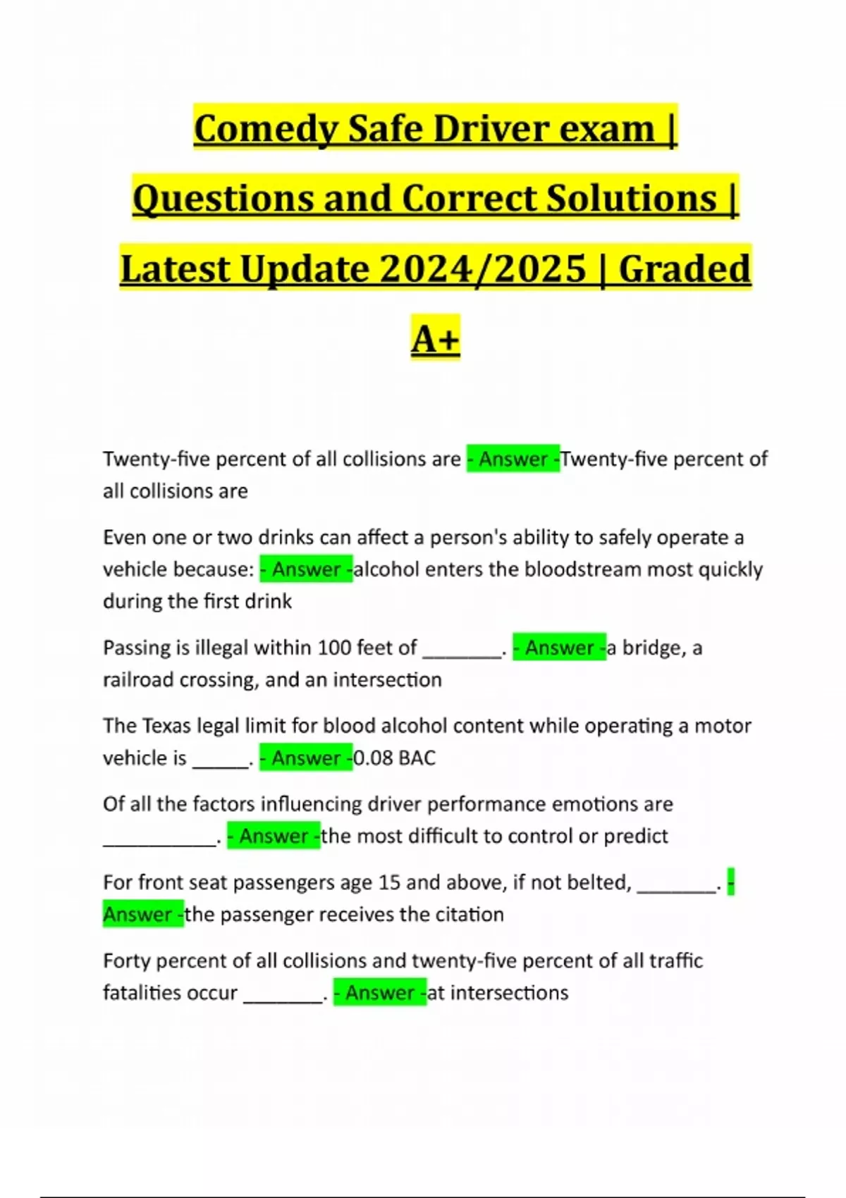 Comedy Safe Driver exam | Questions and Correct Solutions | Latest Update 2024/2025 | Graded A+ Twenty-five percent of all collisions are - Answer -Twenty-five percent of all collisions are Even one or two drinks can affect a person's ability to safely operate a vehicle because: - Answer -alcohol enters the bloodstream most quickly during the first drink Passing is illegal within 100 feet of _______. - Answer -a bridge, a railroad crossing, and an intersection
