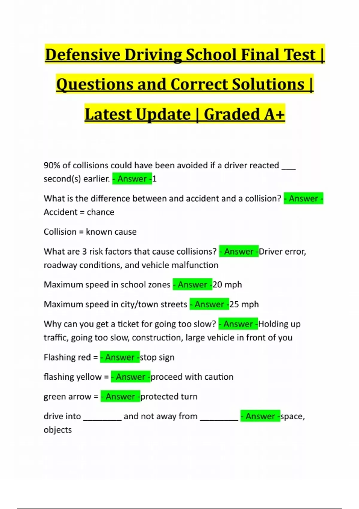 Defensive Driving School Final Test | Questions and Correct Solutions | Latest Update | Graded A+ 90% of collisions could have been avoided if a driver reacted ___ second(s) earlier. - Answer -1 What is the difference between and accident and a collision? - Answer - Accident = chance Collision = known cause What are 3 risk factors that cause collisions? - Answer -Driver error, roadway conditions, and vehicle malfunction Maximum speed in school zones - Answer -20 mph Maximum speed in city/town streets - Answer -25 mph