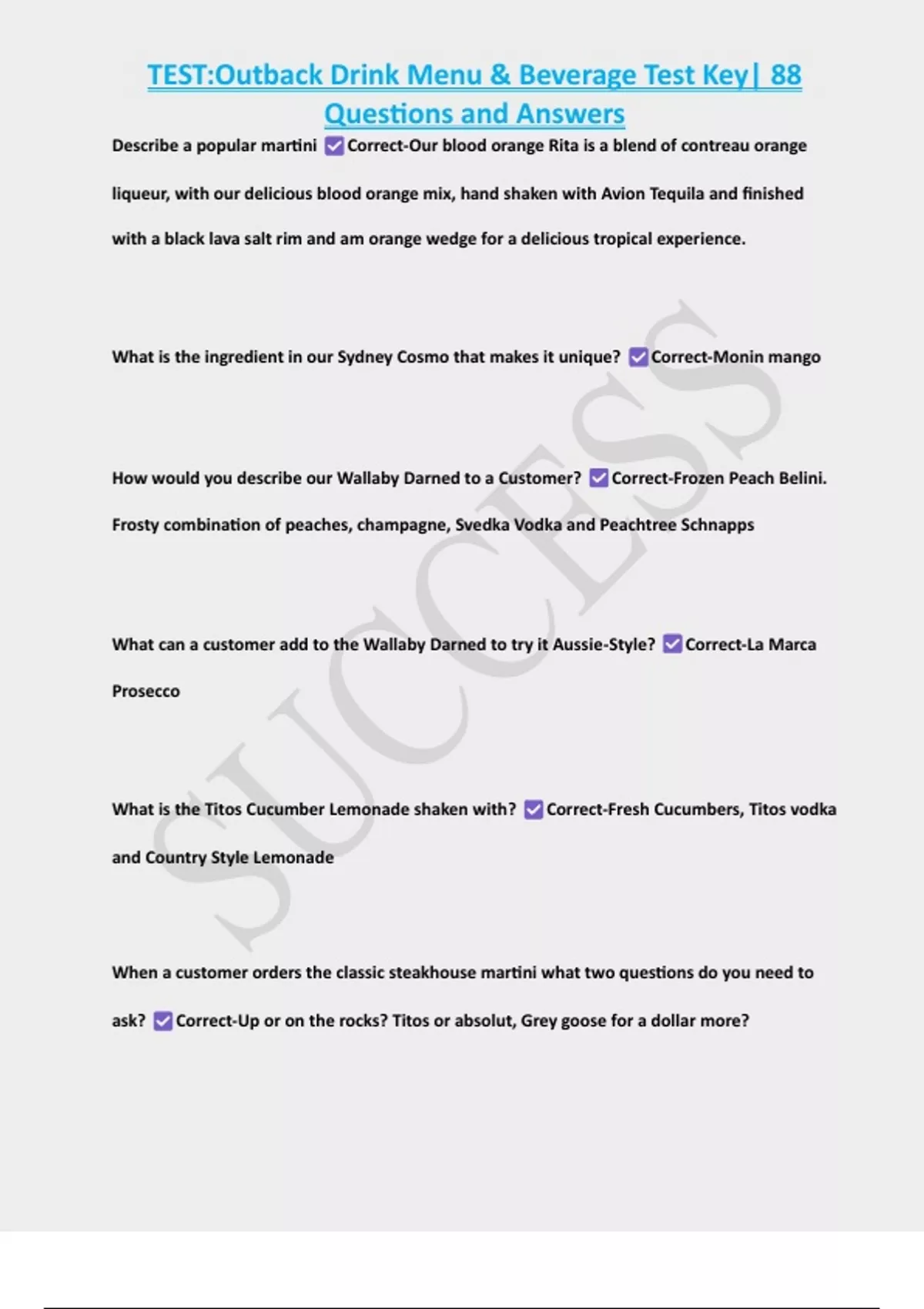 TEST:Outback Drink Menu & Beverage Test Key| 88 Questions and Answers