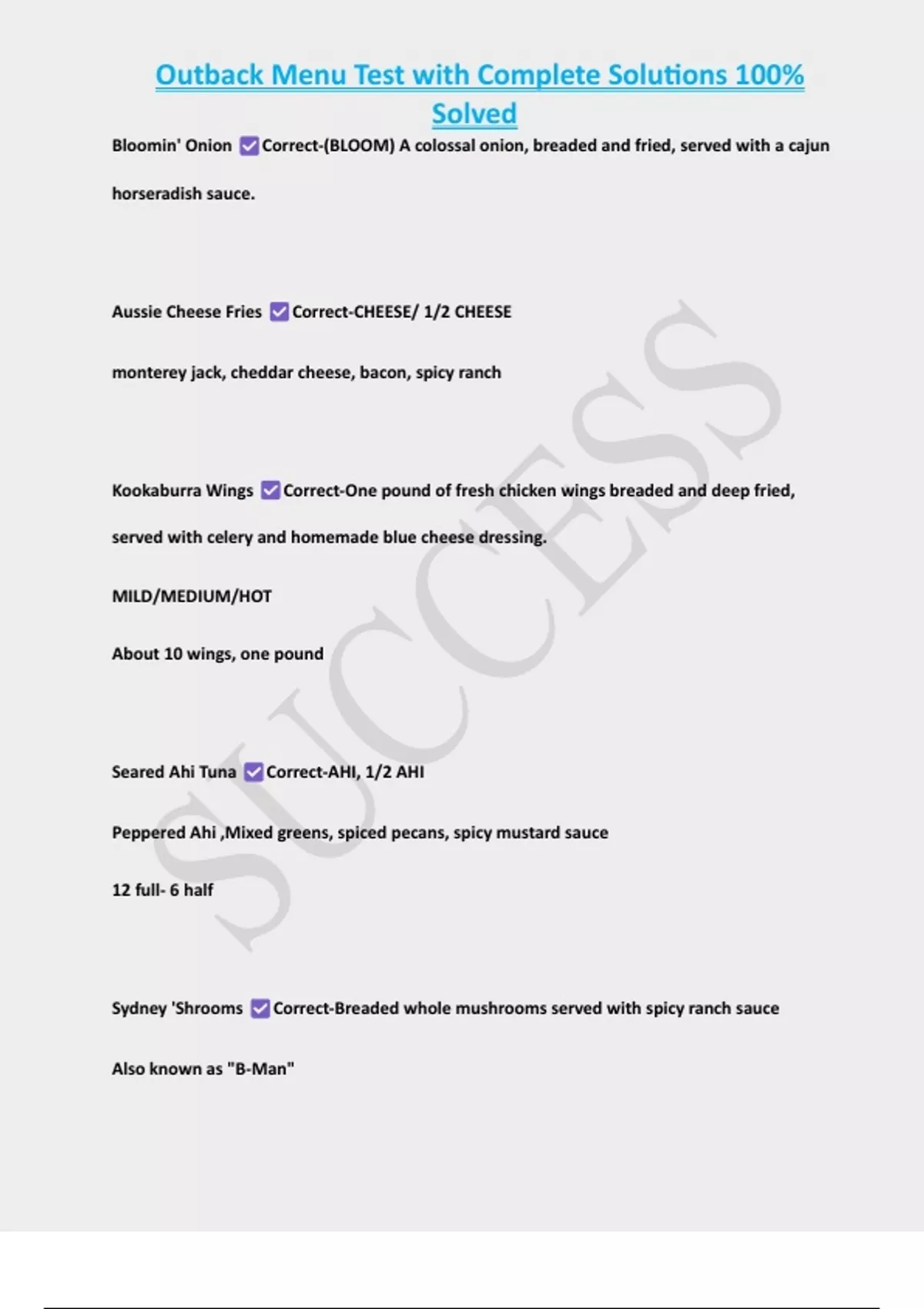 Outback Menu Test with Complete Solutions 100% Solved Bloomin' Onion Correct-(BLOOM) A colossal onion, breaded and fried, served with a cajun horseradish sauce. Aussie Cheese Fries Correct-CHEESE/ 1/2 CHEESE monterey jack, cheddar cheese, bacon, spicy ranch