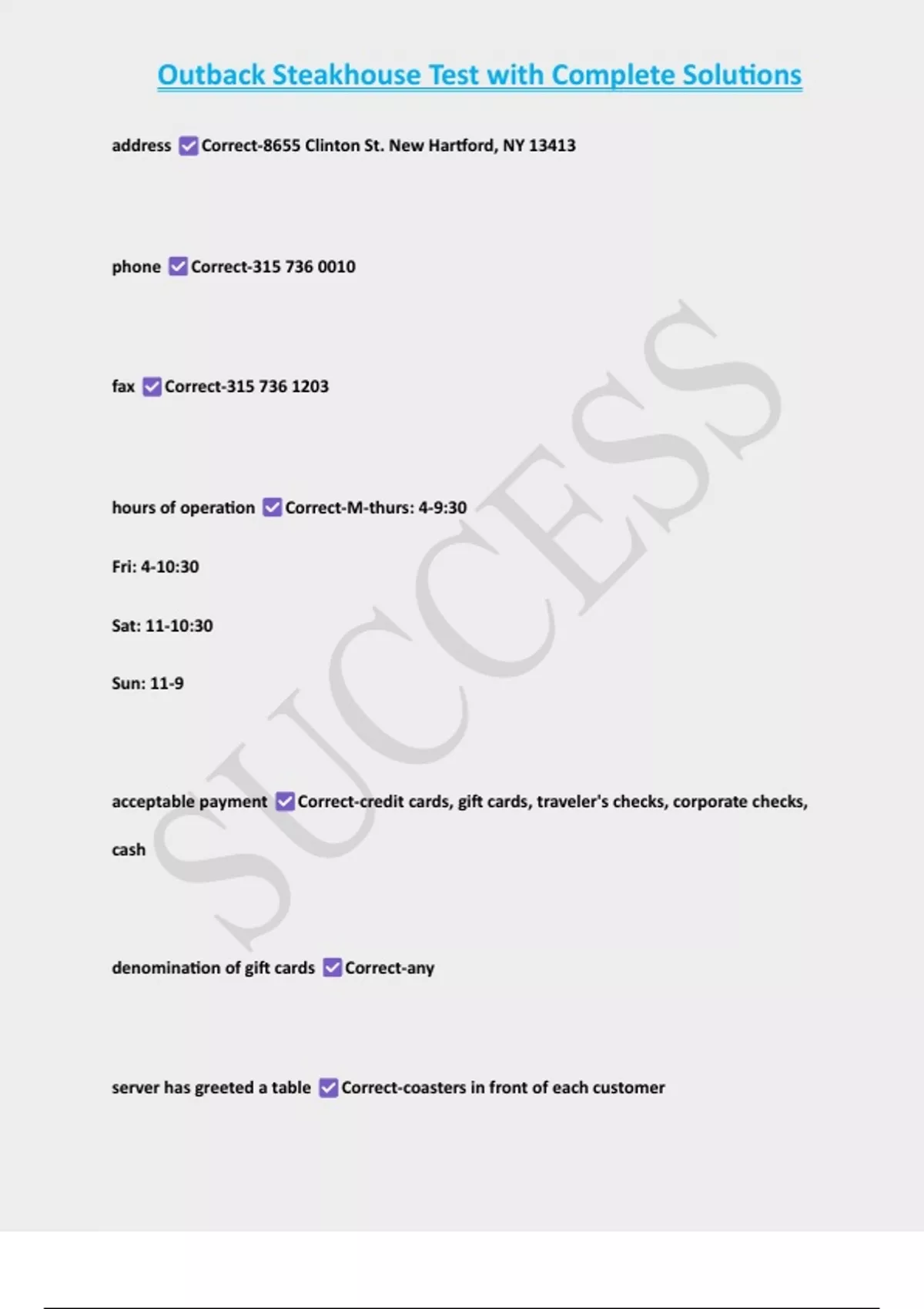 , Outback Steakhouse Test with Complete Solutions