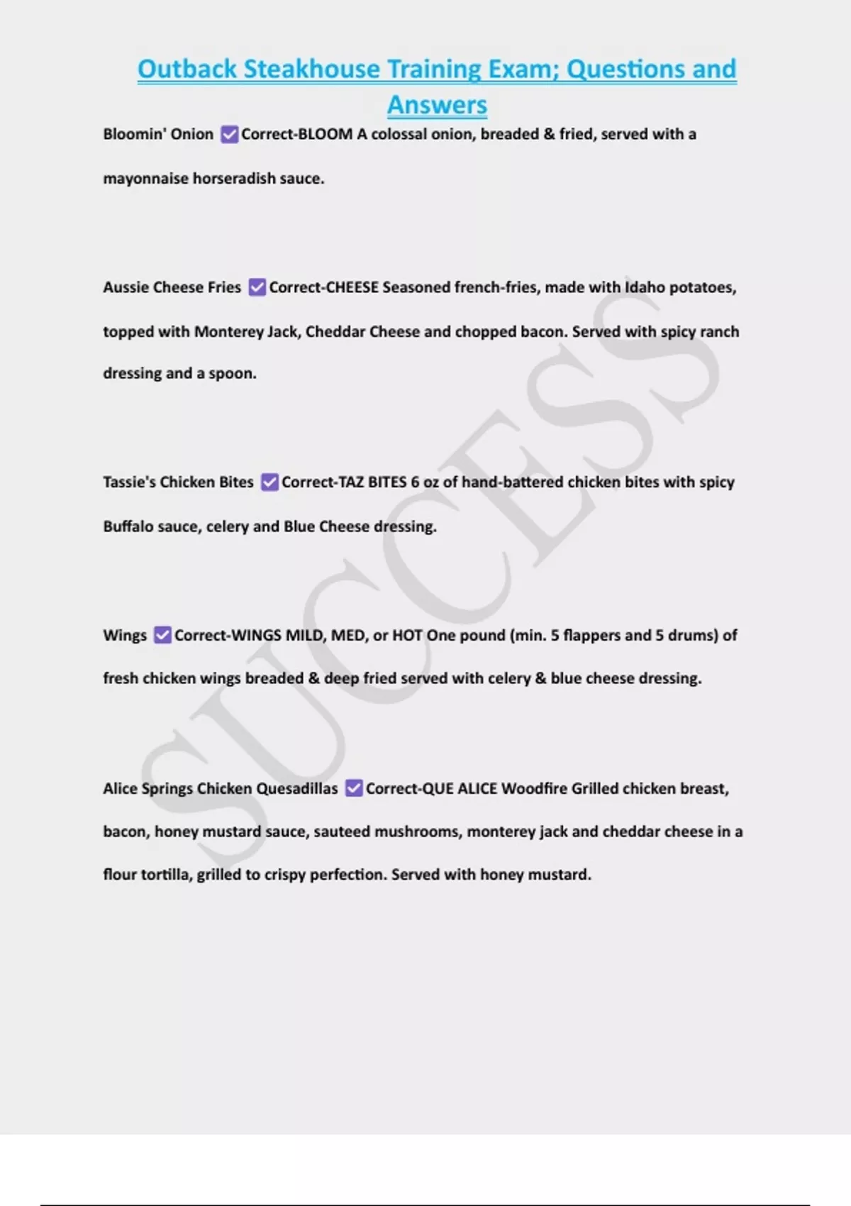 Outback Steakhouse Training Exam; Questions and Answers Bloomin' Onion Correct-BLOOM A colossal onion, breaded & fried, served with a mayonnaise horseradish sauce. Aussie Cheese Fries Correct-CHEESE Seasoned french-fries, made with Idaho potatoes, topped with Monterey Jack, Cheddar Cheese and chopped bacon. Served with spicy ranch dressing and a spoon.