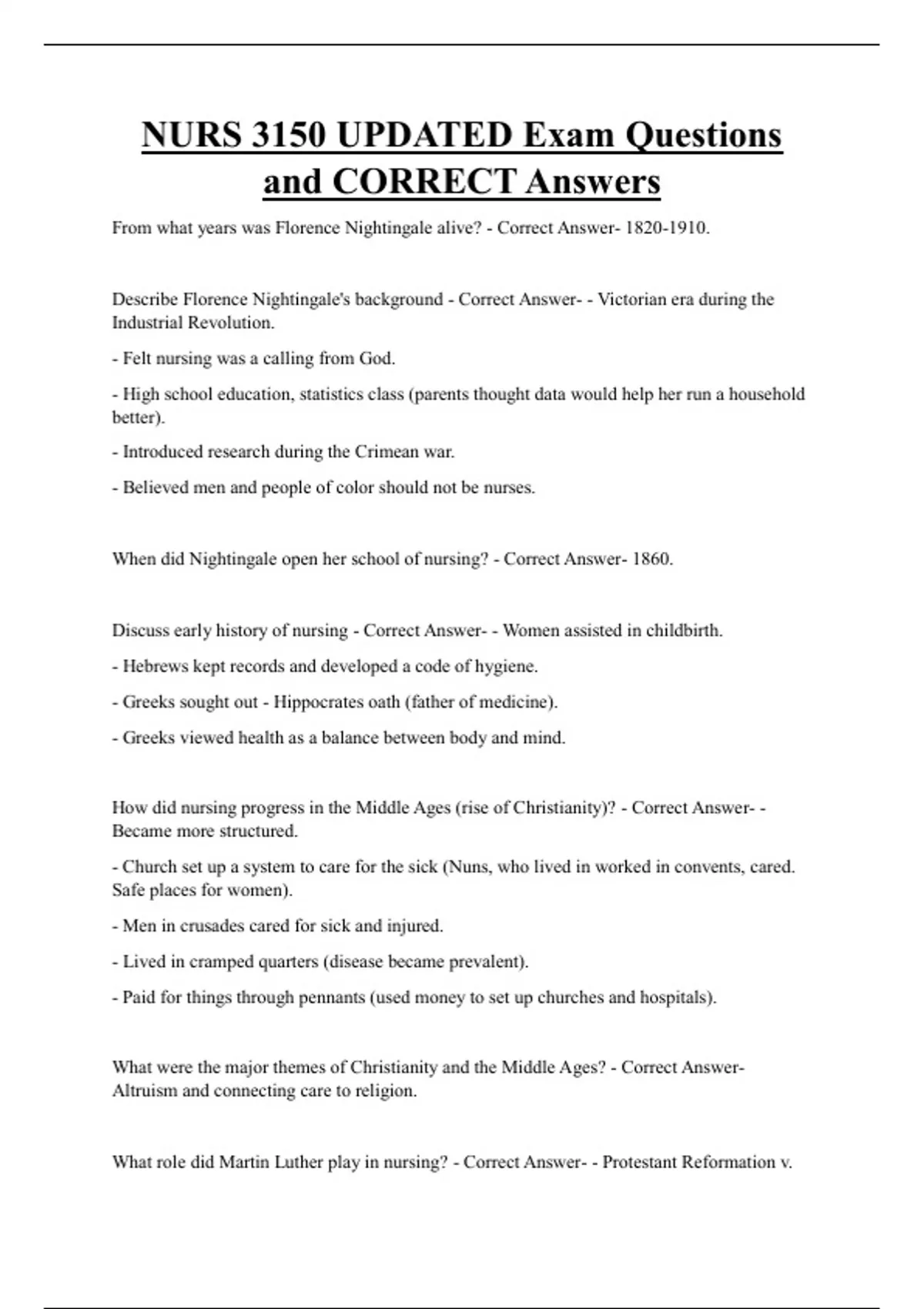 NURS 3150 UPDATED Exam Questions and CORRECT Answers From what years was Florence Nightingale alive? - Correct Answer- . Describe Florence Nightingale's background - Correct Answer- - Victorian era during the Industrial Revolution. - Felt nursing was a calling from God. - High school education, statistics class (parents thought data would help her run a household better). - Introduced research during the Crimean war. - Believed men and people of color should not be nurses