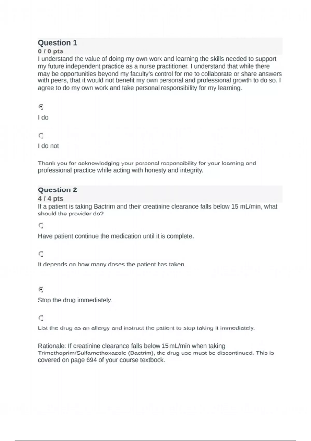Question 1 0 / 0 pts I understand the value of doing my own work and learning the skills needed to support my future independent practice as a nurse practitioner. I understand that while there may be opportunities beyond my faculty’s control for me to collaborate or share answers with peers, that it would not benefit my own personal and professional growth to do so. I agree to do my own work and take personal responsibility for my learning. Correct! I do I do not Thank you for acknowledging your personal responsibility for your learning and professional practice while acting with honesty and integrity