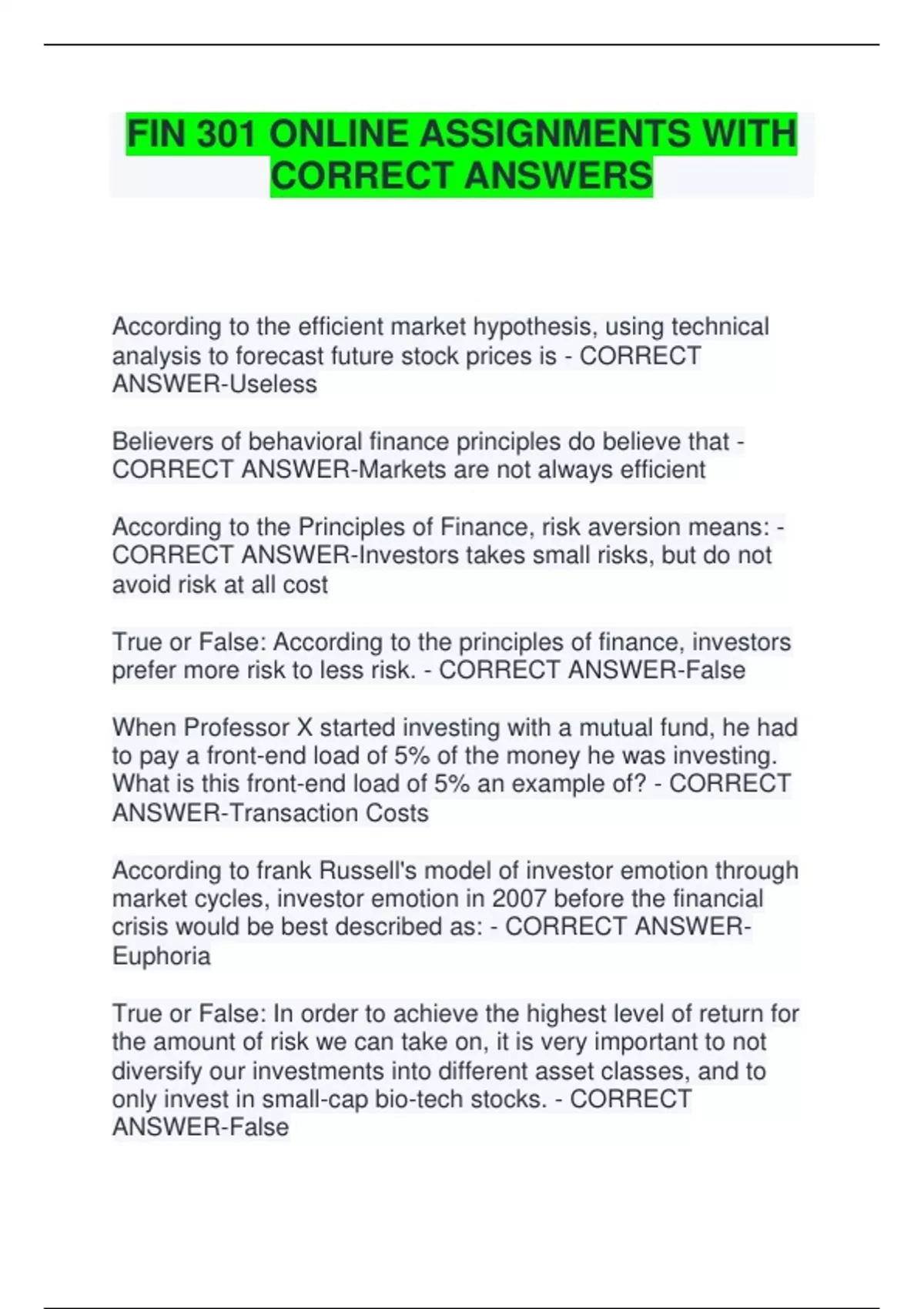 prefer more risk to less risk. - CORRECT ANSWER-False