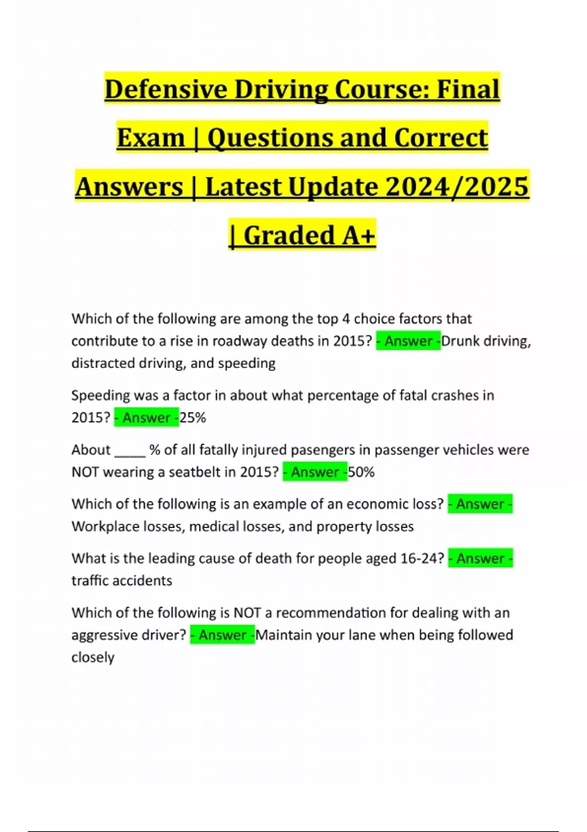 Defensive Driving Course: Final Exam | Questions and Correct Answers | Latest Update 2024/2025 | Graded A+ Which of the following are among the top 4 choice factors that contribute to a rise in roadway deaths in 2015? - Answer -Drunk driving, distracted driving, and speeding Speeding was a factor in about what percentage of fatal crashes in 2015? - Answer -25% About ____ % of all fatally injured pasengers in passenger vehicles were NOT wearing a seatbelt in 2015? - Answer -50% Which of the following is an example of an economic loss? - Answer - Workplace losses, medical losses, and property losses What is the leading cause of death for people aged 16-24? - Answer - traffic accidents Which of the following is NOT a recommendation for dealing with an aggressive driver? - Answer -Maintain your lane when being followed closelySelect all the emotional states that may affect your driving - Answer - Sadness, stress, anger, and anxiety What is the maximum legal blood alcohol content level is a driver