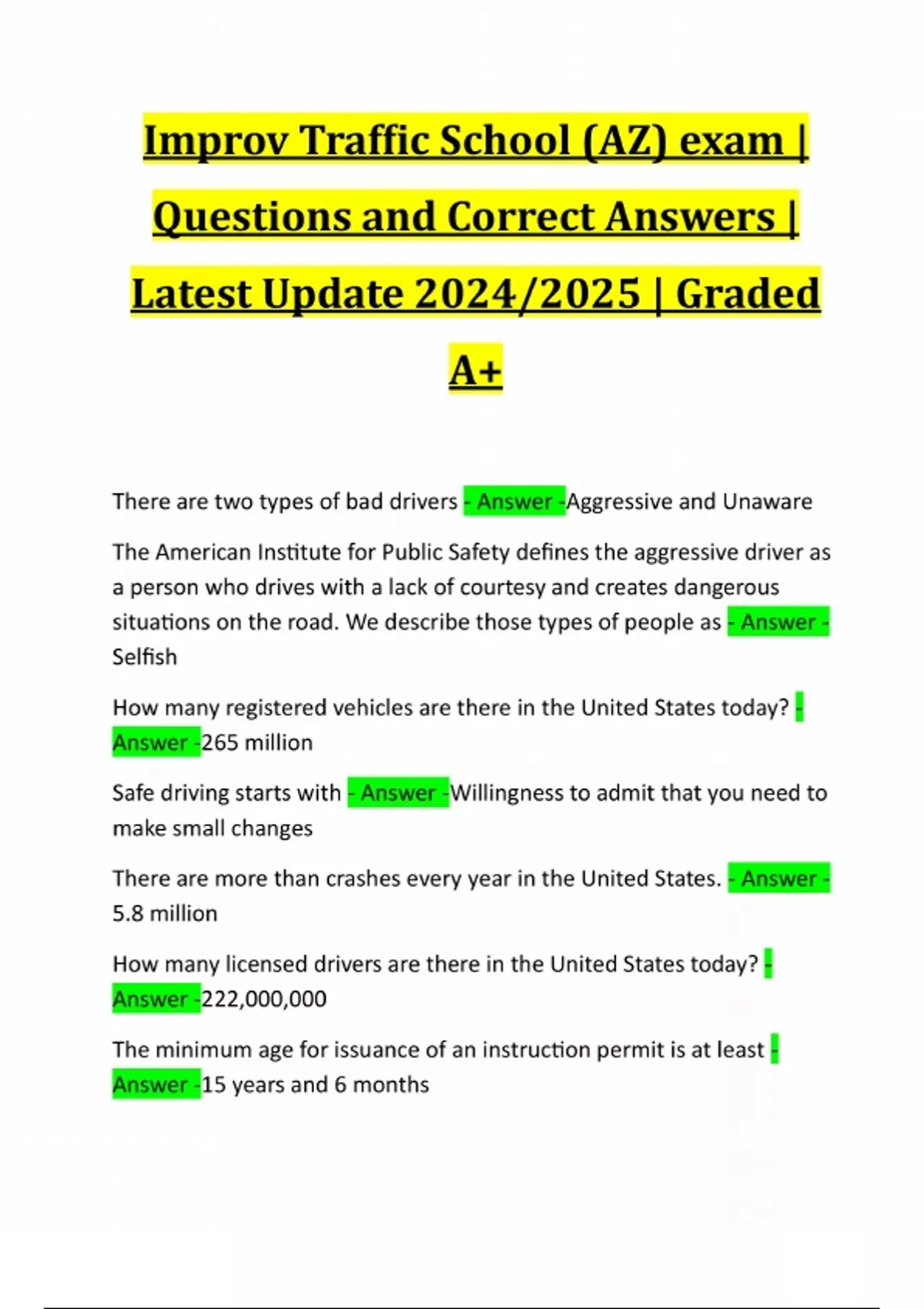 Improv Traffic School (AZ) exam | Questions and Correct Answers | Latest Update 2024/2025 | Graded A+ There are two types of bad drivers - Answer -Aggressive and Unaware The American Institute for Public Safety defines the aggressive driver as a person who drives with a lack of courtesy and creates dangerous situations on the road. We describe those types of people as - Answer - Selfish How many registered vehicles are there in the United States today? - Answer -265 million Safe driving starts with - Answer -Willingness to admit that you need to make small changes There are more than crashes every year in the United States. - Answer - 5.8 million How many licensed drivers are there in the United States today? - Answer -222,000,000 The minimum age for issuance of an instruction permit is at least - Answer -15 years and 6 monthsConvictions stay on your record for - Answer -5 years Arizona's Financial Responsibility Law requires every driver and every owner of a motor vehicle to maintain financial responsibility (liability insurance coverage) at all times. - Answer -True What is the trickiest time of day to drive? - Answer -Twilight Use your when driving in fog. - Answer -Low beams your following distance in any adverse condi