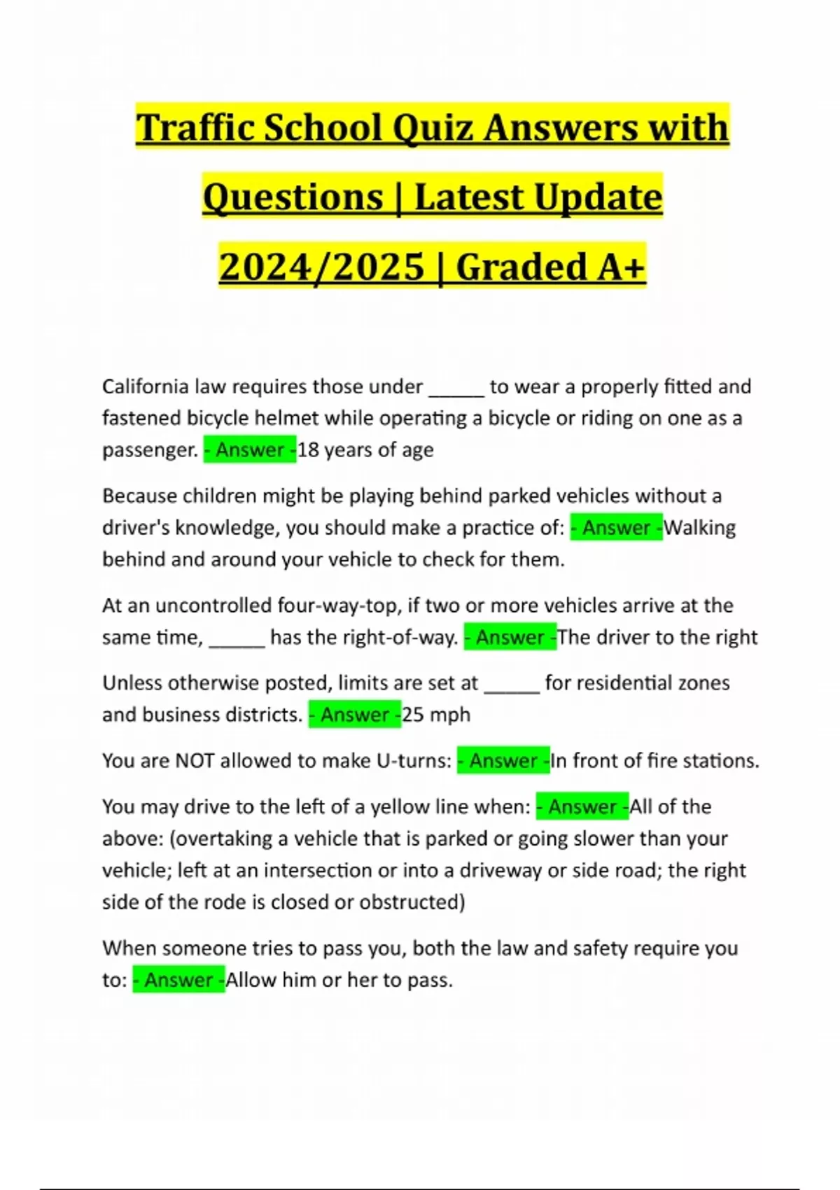 Traffic School Quiz Answers with Questions | Latest Update 2024/2025 | Graded A+ California law requires those under _____ to wear a properly fitted and fastened bicycle helmet while operating a bicycle or riding on one as a passenger. - Answer -18 years of age Because children might be playing behind parked vehicles without a driver's knowledge, you should make a practice of: - Answer -Walking behind and around your vehicle to check for them. At an uncontrolled four-way-top, if two or more vehicles arrive at the same time, _____ has the right-of-way. - Answer -The driver to the right Unless otherwise posted, limits are set at _____ for residential zones and business districts. - Answer -25 mph You are NOT allowed to make U-turns: - Answer -In front of fire stations. You may drive to the left of a yellow line when: - Answer -All of the above: (overtaking a vehicle that is parked or going slower than your vehicle; left at an intersection or into a driveway or side road; the right side of the rode is closed or obstructed) When someone tries to pass you, both the law and safety require you to: - Answer -Allow him or her to pass._____ refers to speeding without realizing it. - Answer -Velocitation Driving with an expired license, unsa