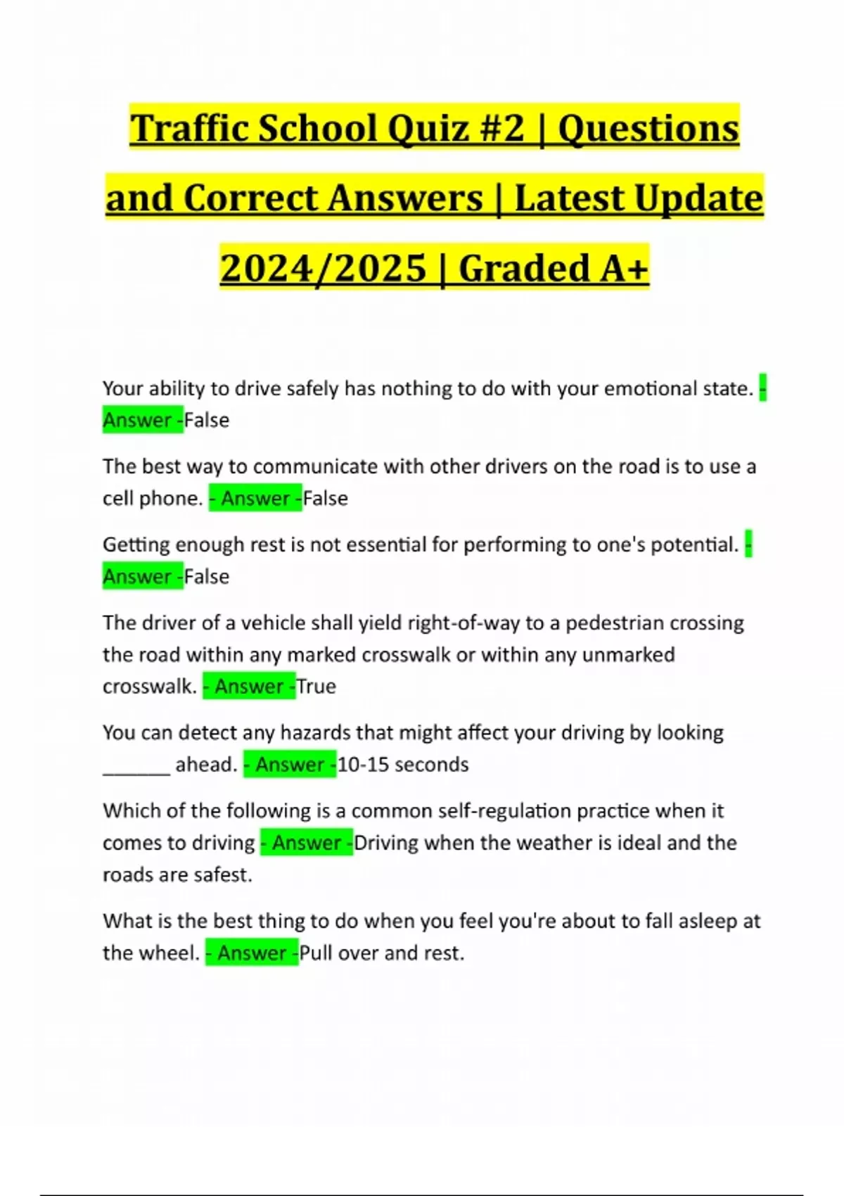 Traffic School Quiz #2 | Questions and Correct Answers | Latest Update 2024/2025 | Graded A+ Your ability to drive safely has nothing to do with your emotional state. - Answer -False The best way to communicate with other drivers on the road is to use a cell phone. - Answer -False Getting enough rest is not essential for performing to one's potential. - Answer -False The driver of a vehicle shall yield right-of-way to a pedestrian crossin