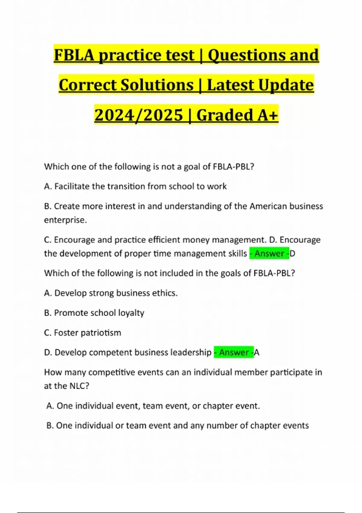 FBLA practice test | Questions and Correct Solutions | Latest Update 2024/2025 | Graded A+ Which one of the following is not a goal of FBLA-PBL? A. Facilitate the transition from school to work B. Create more interest in and understanding of the American business enterprise. C. Encourage and practice efficient money management. D. Encourage the development of proper time management skills - Answer -D Which of the following is not included in the goals of FBLA-PBL? A. Develop strong business ethics. B. Promote school loyalty C. Foster patriotism D. Develop competent business leadership - Answer -A How many competitive events can an individual member participate in at the NLC? A. One individual event, team event, or c