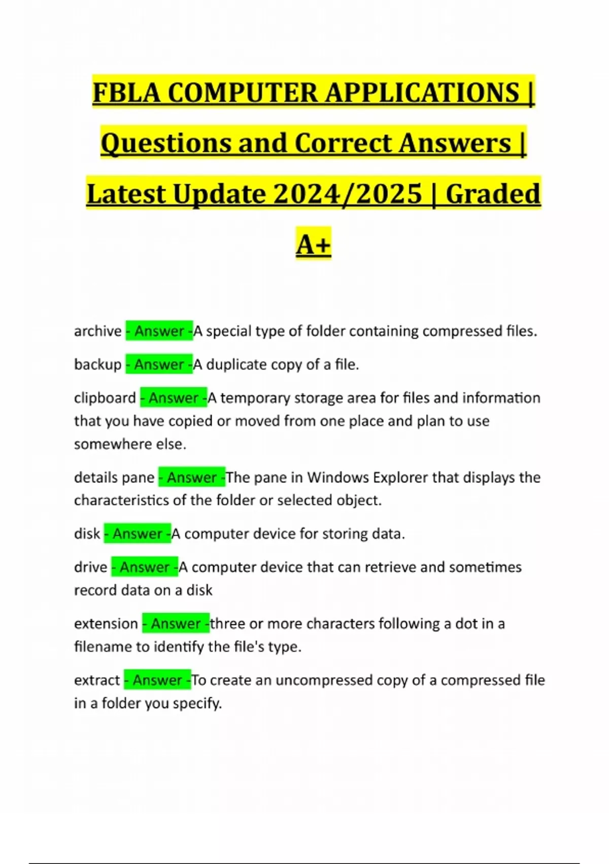 FBLA COMPUTER APPLICATIONS | Questions and Correct Answers | Latest Update 2024/2025 | Graded A+ archive - Answer -A special type of folder containing compressed files. backup - Answer -A duplicate copy of a file. clipboard - Answer -A temporary storage area for files and information that you have copied or moved from one place and plan to use somewhere else. details pane - Answer -The pane in Windows Explorer that displays the characteristics of the folder or selected object. disk - Answer -A computer device for storing data. drive - Answer -A computer device that can retrieve and sometimes record data on a disk extension - Answer -three or more characters following a dot in a filename to identify the file's type. extract - Answer -To create an uncompressed copy of a compressed file in a folder you - Answer -A collection of data that has a name and is stored on a computer File Explorer - Answer -A Windows 8 tool that displays the contents of your computer and uses icons to represent drives, folders, and files. file icon - Answer -An icon that indicates a file's type. file path - Answer -A notation that indicates a file's location. file system - Answer -An operating system's hierarchy of folders and files, which ensures system stability and enables Windows to find file