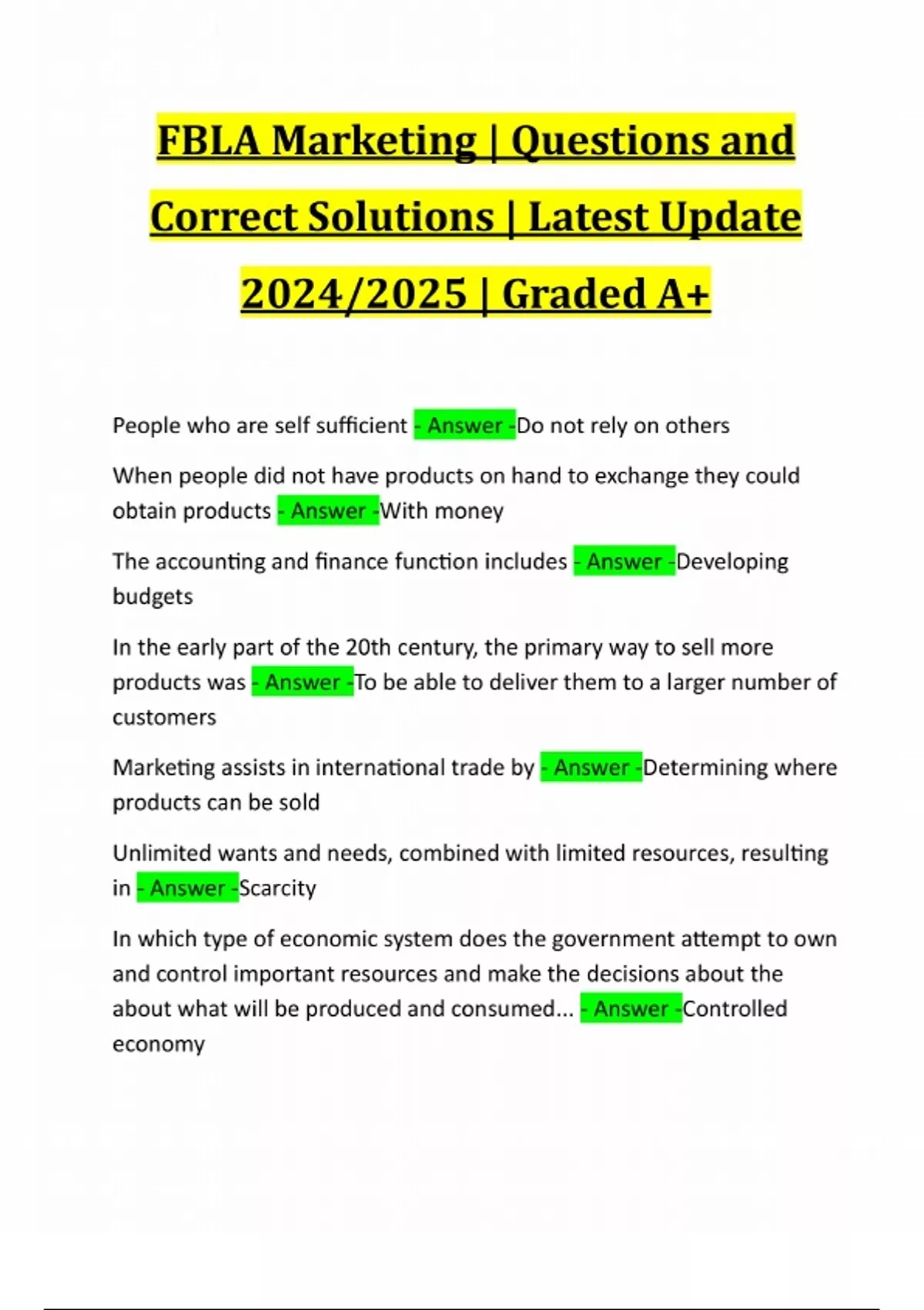 FBLA Marketing | Questions and Correct Solutions | Latest Update 2024/2025 | Graded A+ People who are self sufficient - Answer -Do not rely on others When people did not have products on hand to exchange they could obtain products - Answer -With money The accounting and finance function includes - Answer -Developing budgets In the early part of the 20th century, the primary way to sell more products was - Answer -To be able to deliver them to a larger number of customers Marketing assists in international trade by - Answer -Determining where products can be sold Unlimited wants and needs, combined with limited resources, resulting in - Answer -Scarcity In which type of economic system does the government attempt to own and control important resourc