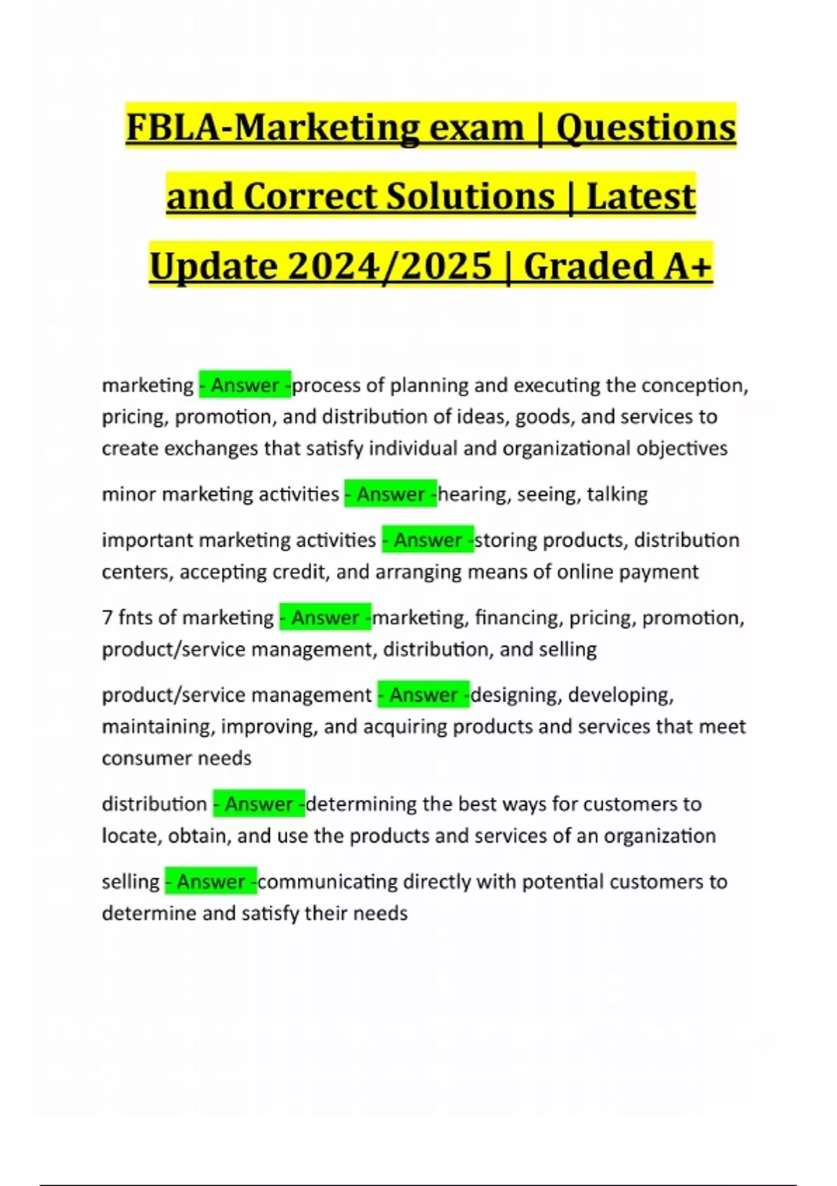 FBLA-Marketing exam | Questions and Correct Solutions | Latest Update 2024/2025 | Graded A+