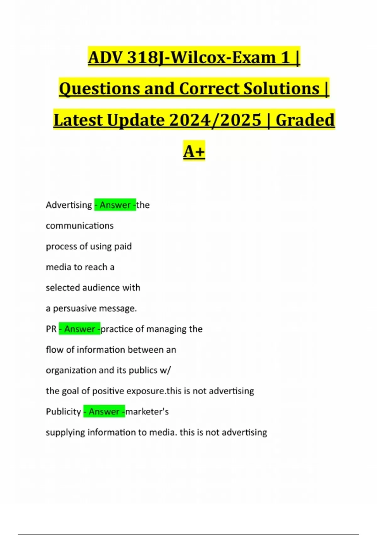 ADV 318J-Wilcox-Exam 1 | Questions and Correct Solutions | Latest Update 2024/2025 | Graded A+
