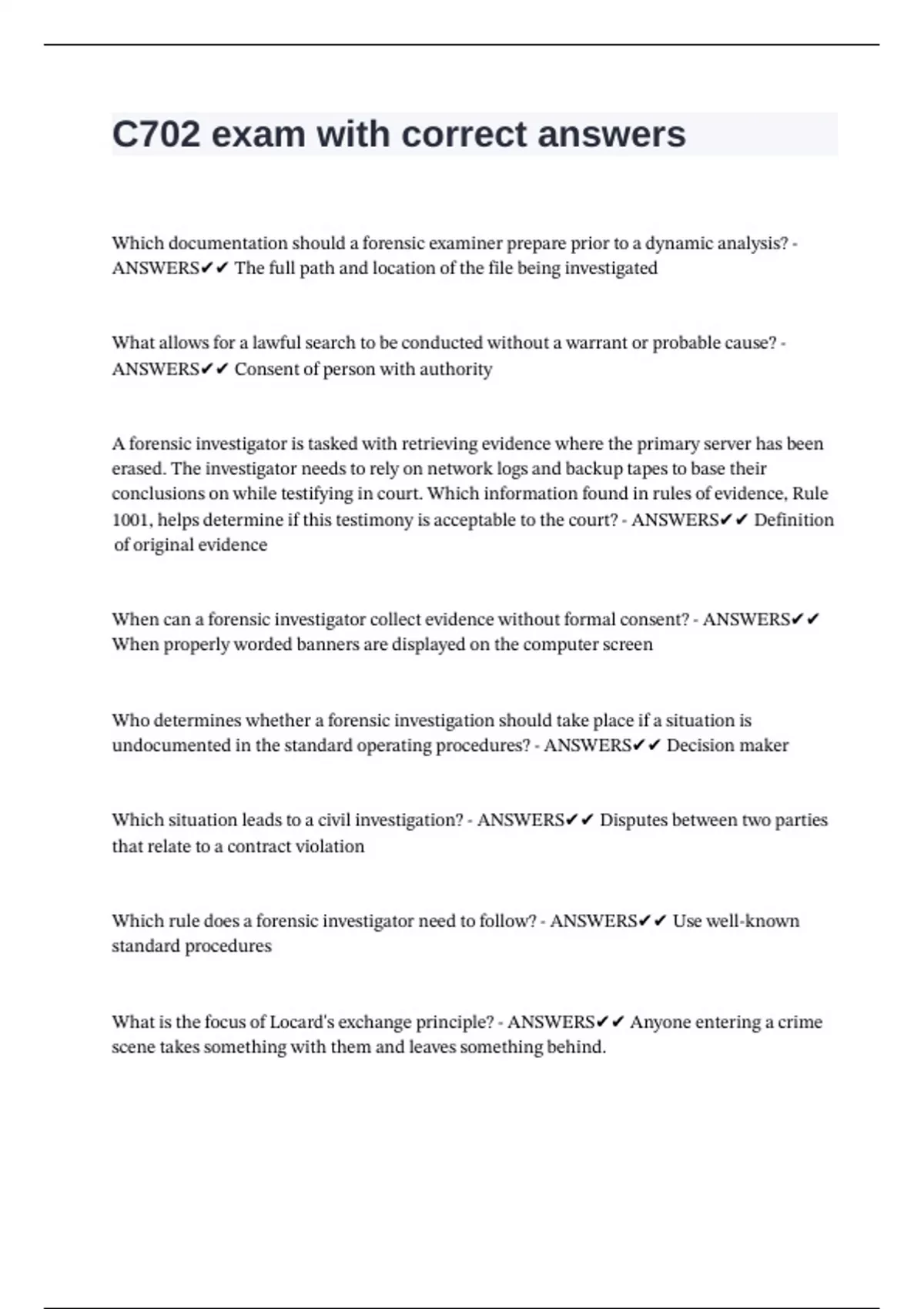 What |is |the |focus |of |Locard's |exchange |principle? |- |ANSWERS✔✔ |Anyone |entering |a |crime |